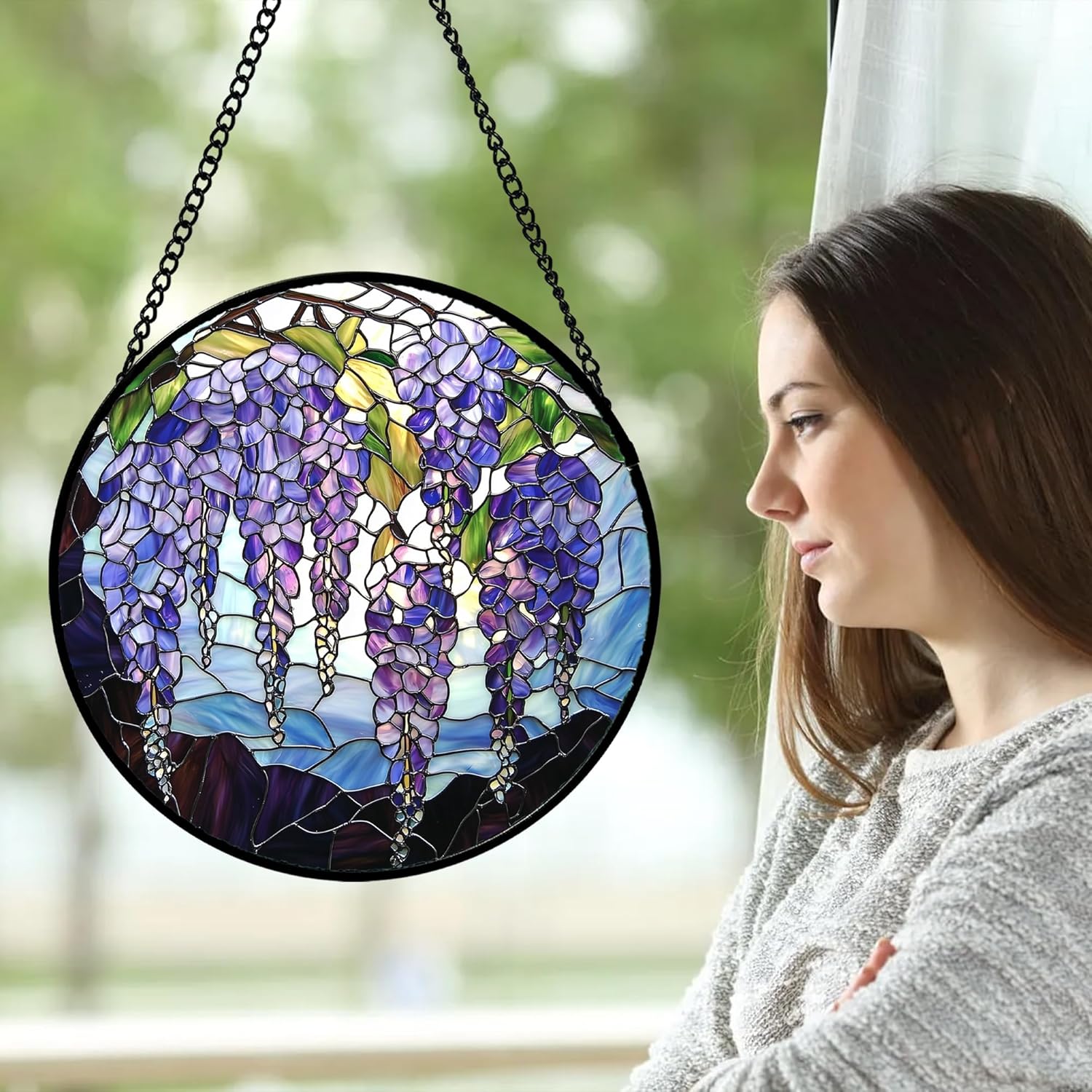 Stained Glass Window Hanging, Purple Wisteria Flowers Suncatcher for Doors Window Home Plant Sun Catchers Decoration Mother's Day Birthday Gifts for Women, Men, and Mom 11.8x11.8 in