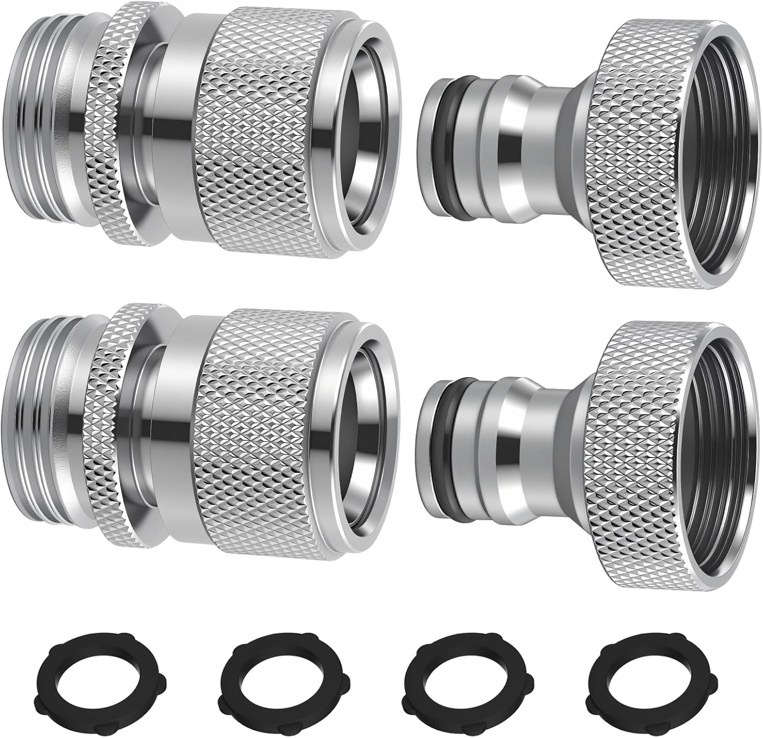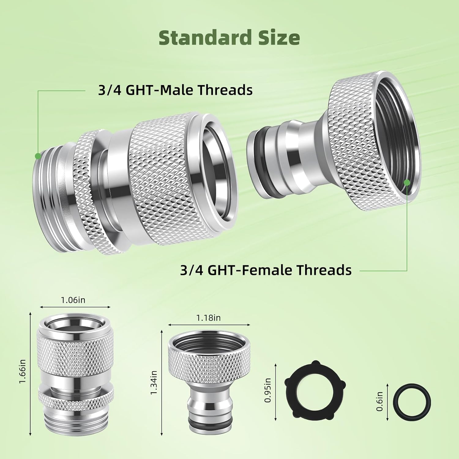- Universal 3/4 Inch GHT Thread: Each set includes a female adapter (3/4" GHT female thread) and a male adapter (3/4" GHT male thread), designed to fit standard 3/4 inch garden hoses, outdoor faucets and other garden watering equipment. Perfect for seamless compatibility with most household and professional gardening tools