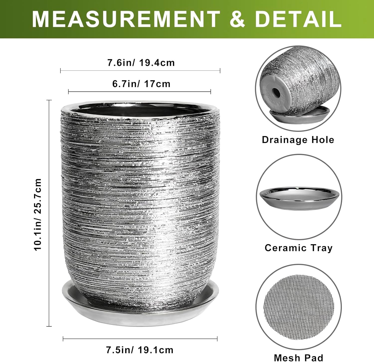 - Size of Ceramic Plant Pot: Each silver planter is 7.6” in outer diameter and 10.1” in height. The optimal size makes plant pot an ideal home for planting cactus, monstera, money tree, ficus lyrata, olive tree, succulent