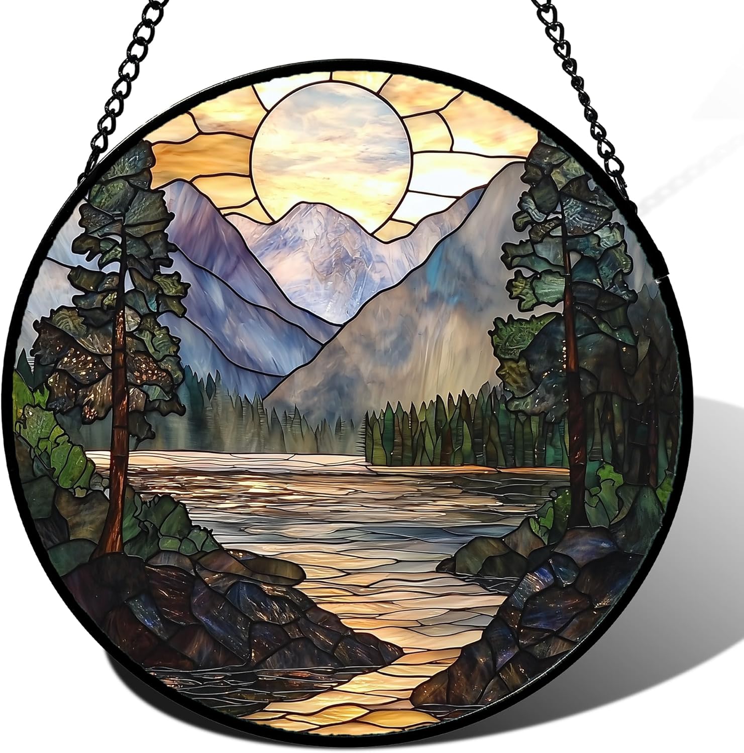 Stained Glass Window Hanging, Sunset Mountains Lake Tree Sun Catcher for Window Home Decor Landscape Suncatcher Mother's Day Birthday Gifts for Women Men Mom and Nana 7.8 in