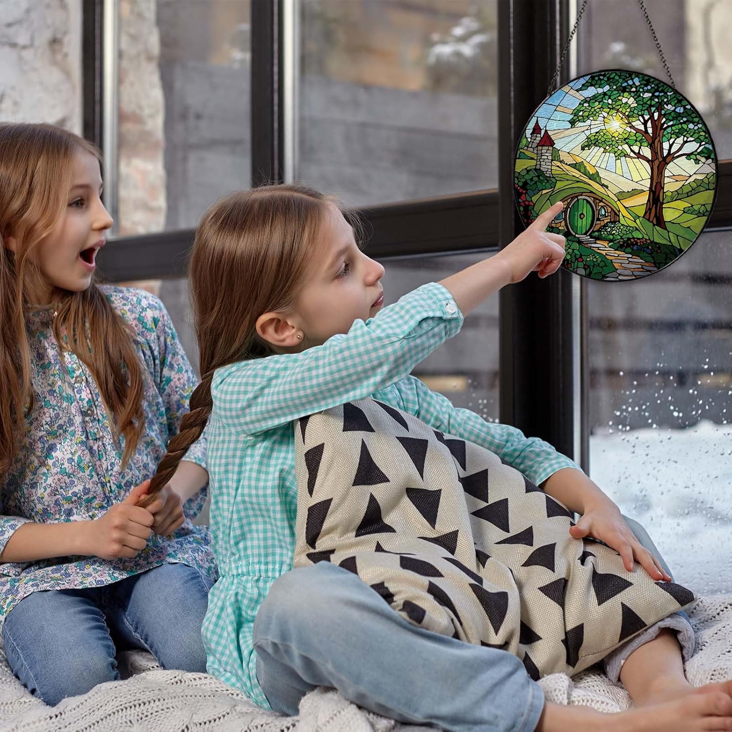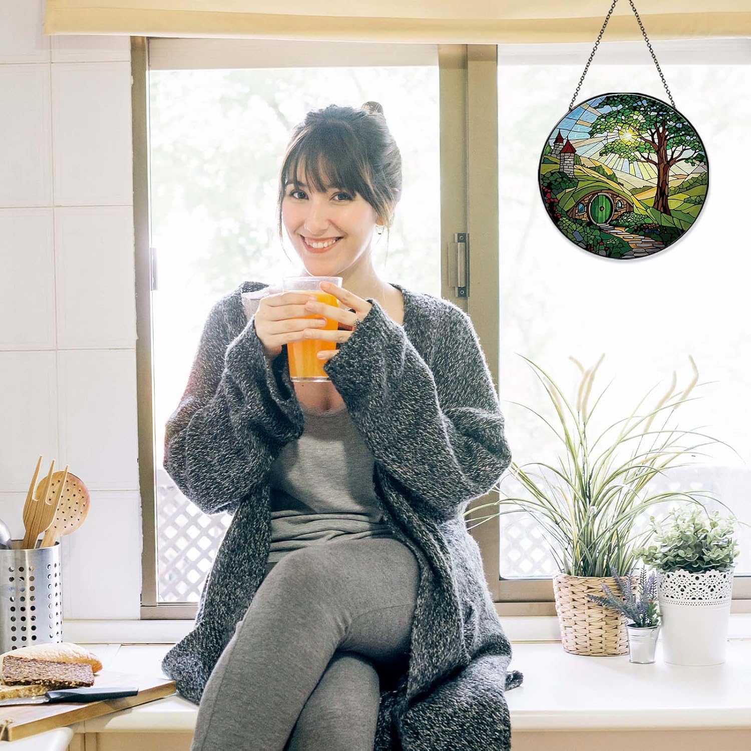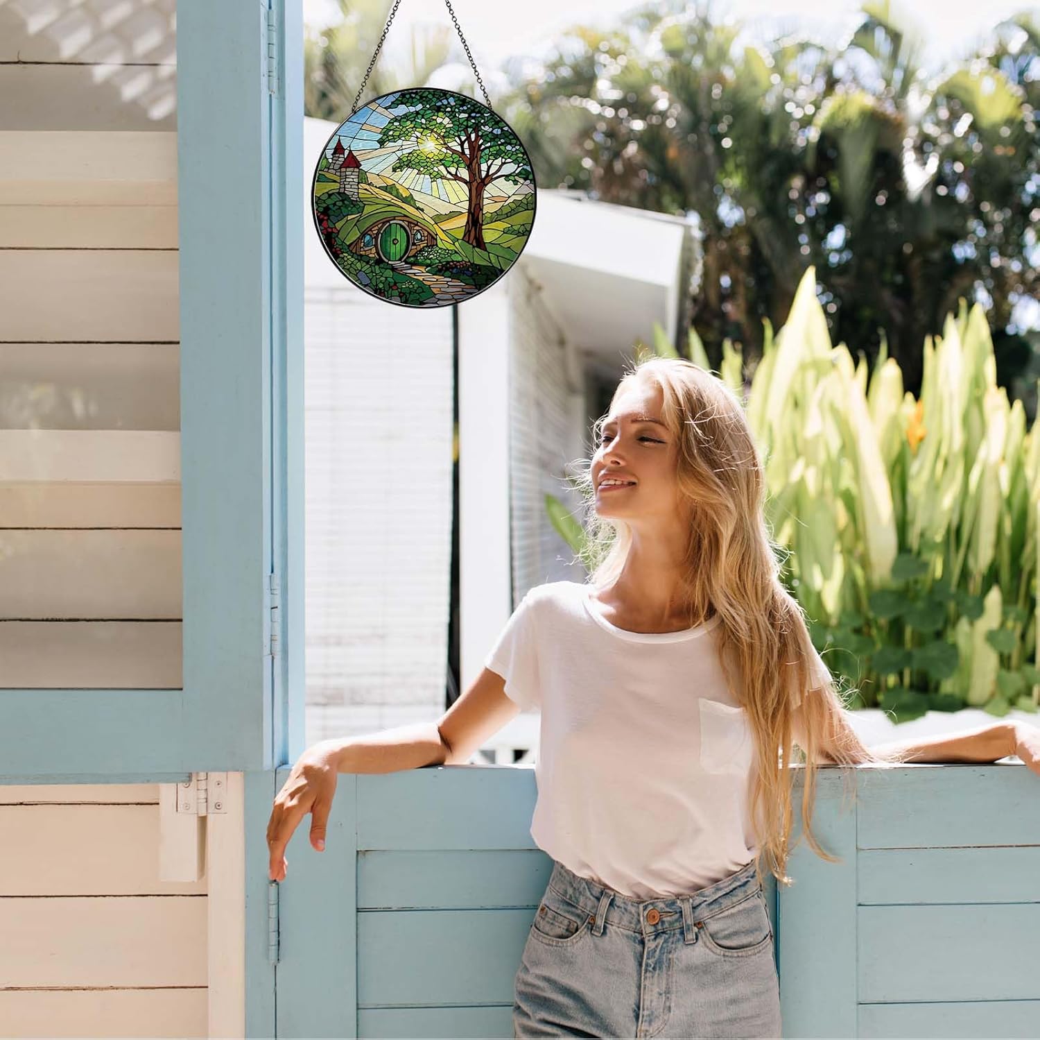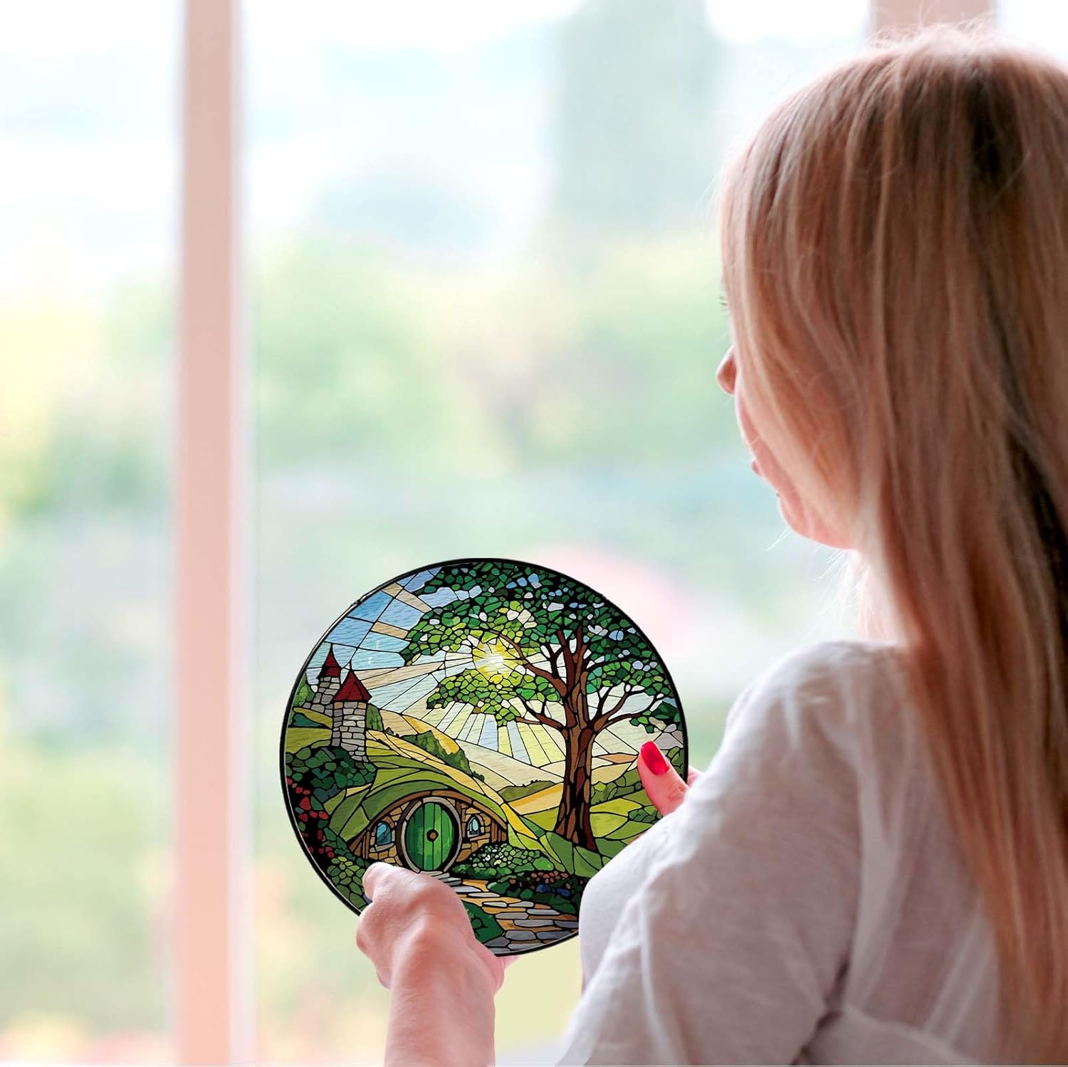 Shire Sun Catcher Stained Glass Window Hanging Gifts for Countryside Lover Women Scenery Wall Decor Handmade Sun Catcher Decoration for Home Garden Housewarming Gifts