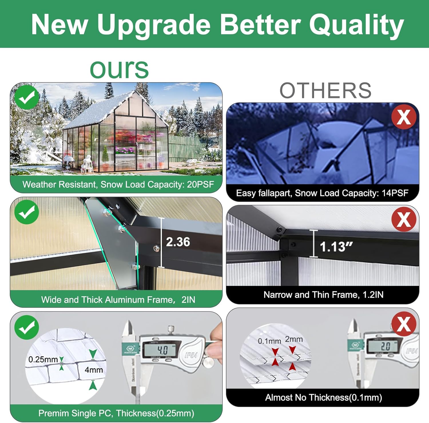- đ»Sturdy Frame: Our greenhouse kit boasts a robust rust-resistant aluminum frame designed to withstand various weather conditions. 2 skilled enthusiasts can assemble this greenhouse kit within just 4-6 hours. Introducing patented technology, Easy assembly, saving you 50% of your time. Gone are the days of tedious setups. With a simple push and locking screw, our Quick Connect ensures a reliable, secure, and swift link-up. It can also support snow loads of up to 20PSF.