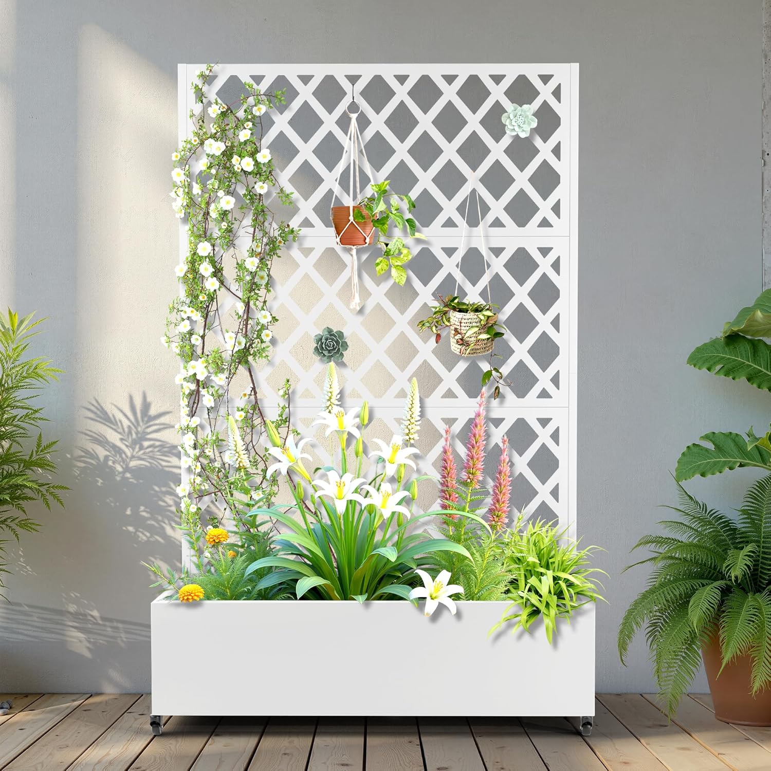 Metal Raised Garden Bed with Trellis and Wheels, 2 in 1 Trellis with Planter Box & Privacy Screen for Climbing Plants, Outdoor Standing Flower Beds with Drainage Holes, 47.2''L×15.7''W×70.9''H, White