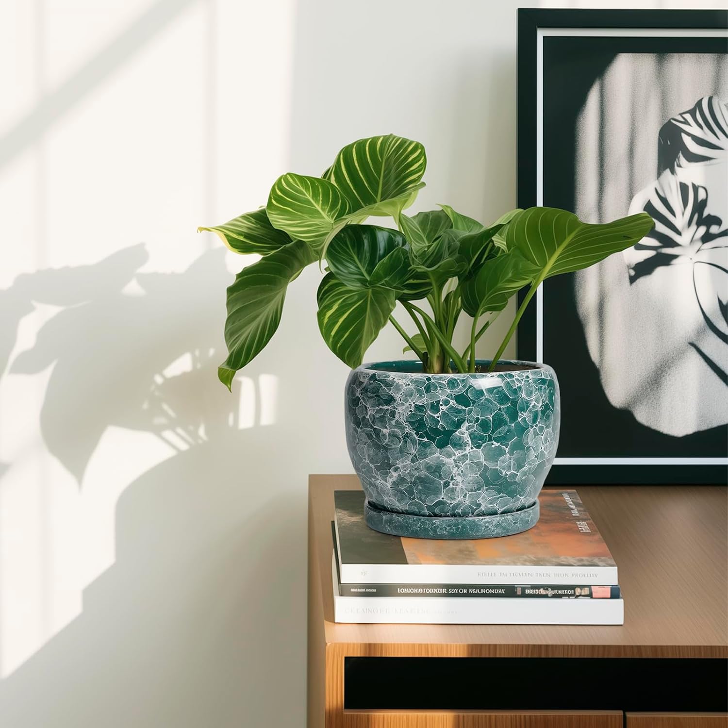- Drainage Hole and Saucer: Plant pot indoor with drainage hole efficiently removes excess water, helping your plants thrive. The ceramic tray catches any overflow, so you can place the green plant pot anywhere with confidence