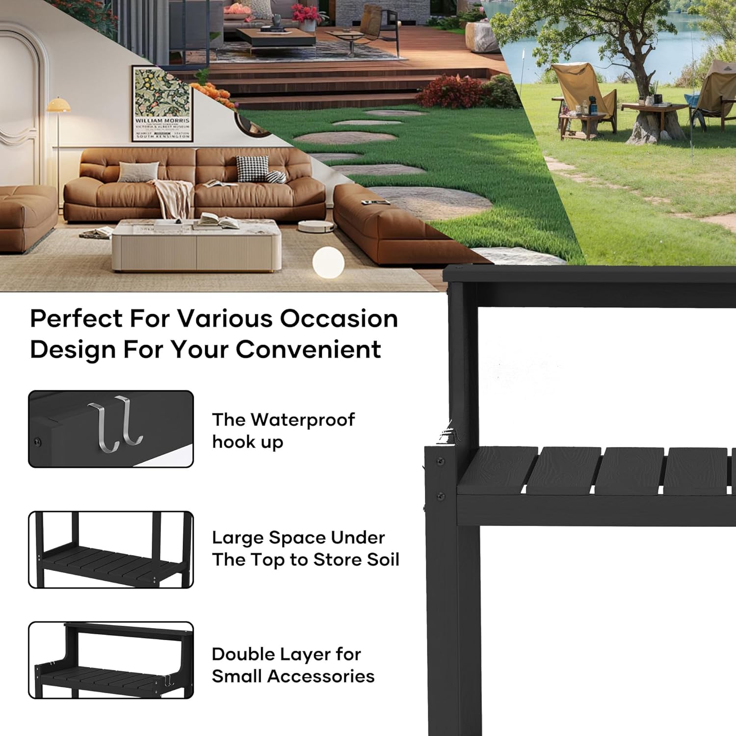 Outdoor Potting Bench HDPS Potting Table with 4 Side Hooks All-Weather Garden Table Work Station 360lbs Capacity Garden Potting Bench for Porch Black