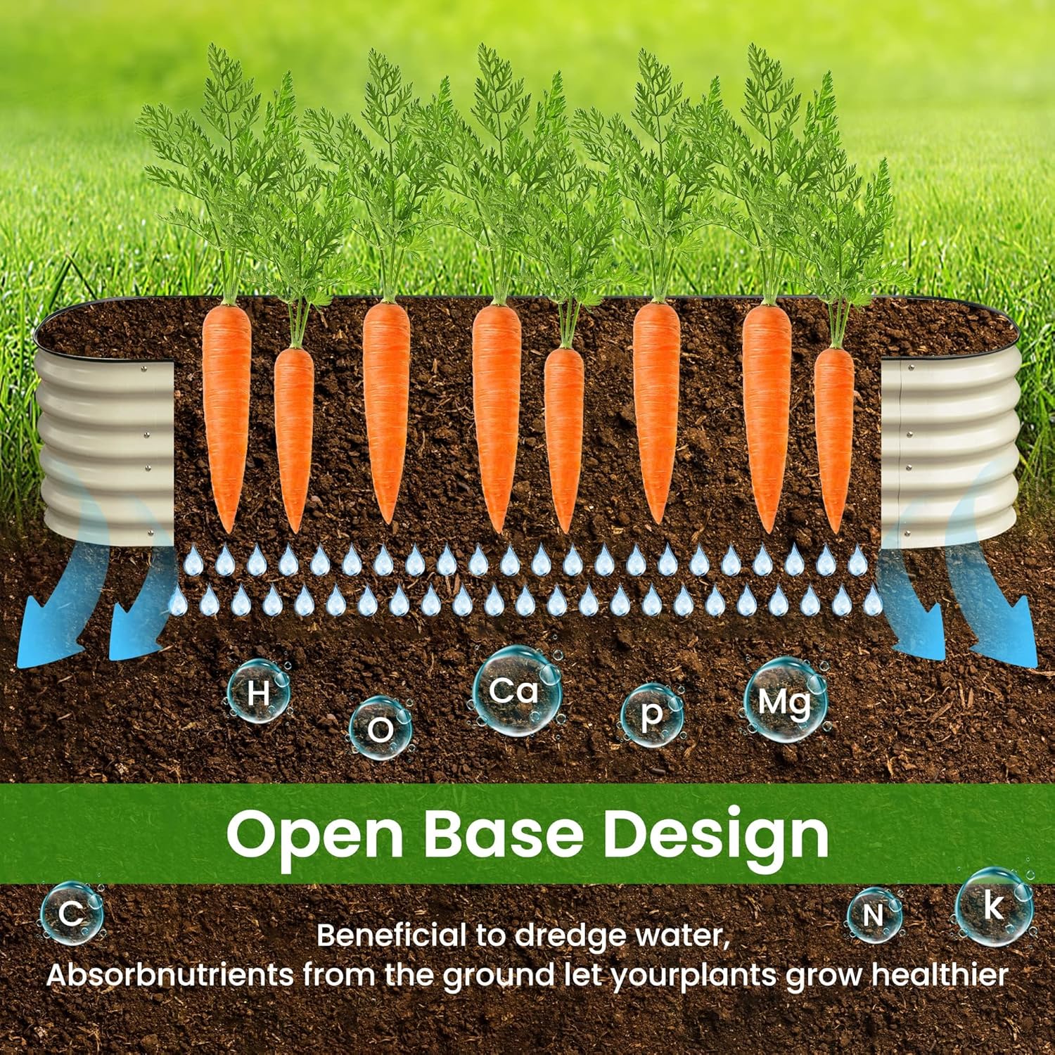 - Open Base Design:This metal raised garden bed is designed with an open base, makes this the perfect space to layer yard waste,grass clippings, fruits/veggies, or coffee grounds, to create enriched soil in your own backyard,It allow the roots absorb better nutrients, providing good drainage, and protect your plants.