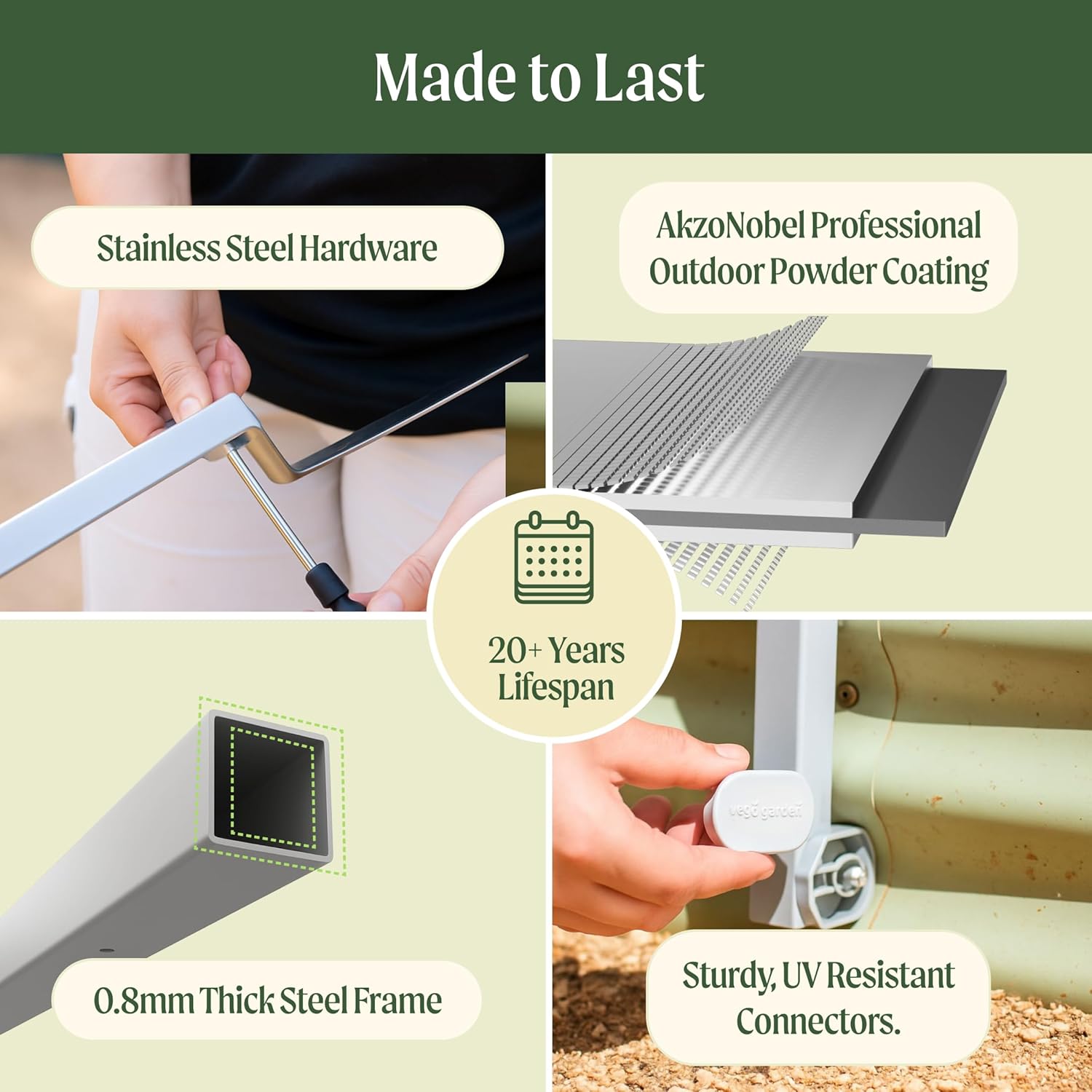 - Comfortable walking width of 4.5ft between garden beds, standard height of 7.5ft, can be extended to 8ft,and customized using different bolt holes.