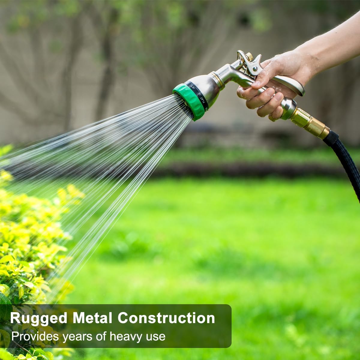 - 7 WATERING PATTERNS: Rotate the nozzle head dial to select a water pattern you needed. Whether you need the high-pressure jet to clean your patio or the soft shower to water your garden, the 7 patterns have you covered. Perfect for cleaning cars or hard surface, watering lawns & garden, and washing a dog.