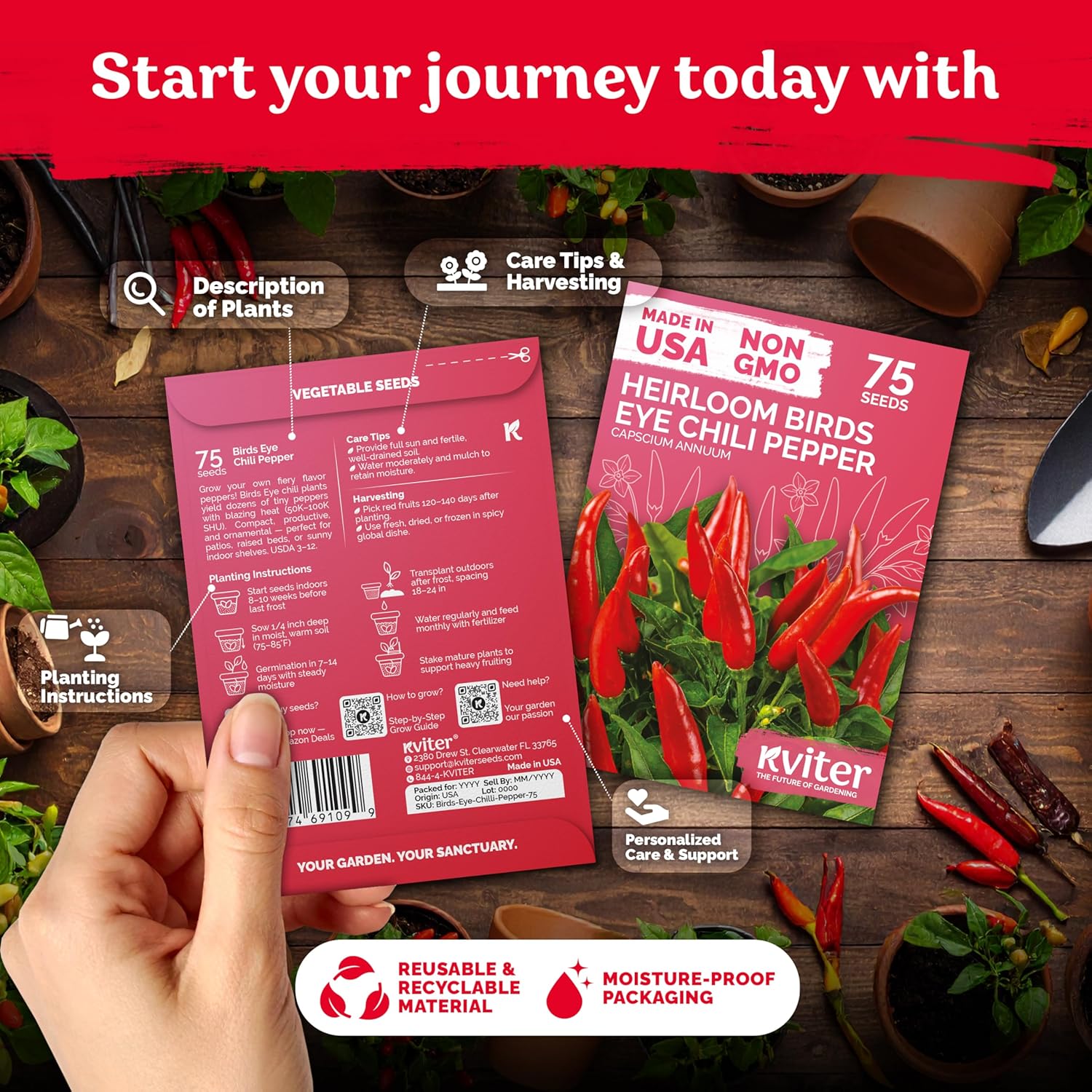 - Easy to Plant & Care: Sow birds eye chilis heirloom seeds 1/4" deep, spacing 18–24" indoors 8-10 weeks before last frost, then transplant outdoors. Capsicum annuum loves full sun, fertile 6.0-6.8 pH soil, moderate moisture. Harvest in ~120-140 days.