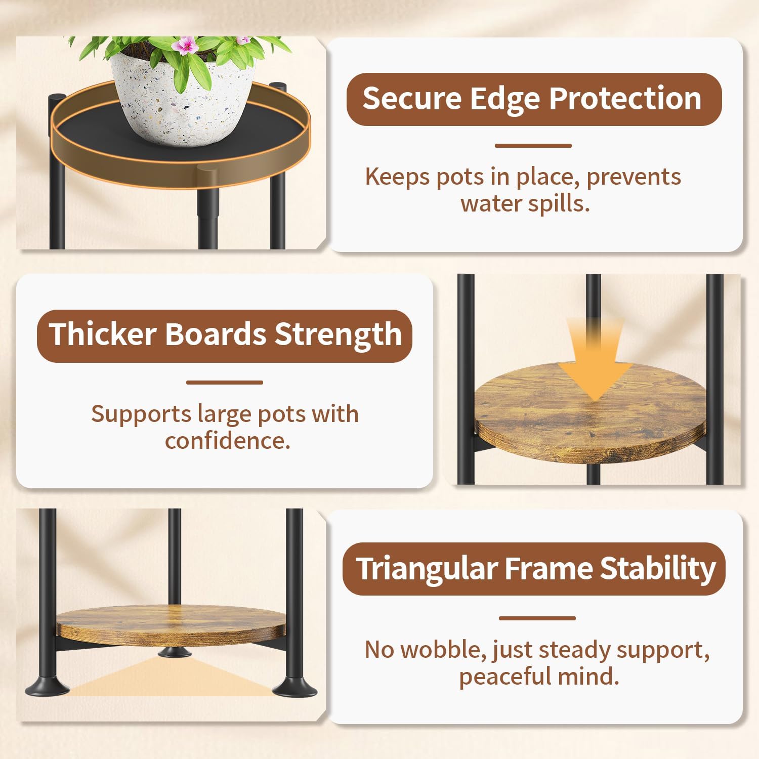 - 【No More Water Spills】The top tray of the tall minimalist flower stands has a raised edge to prevent any plants from slipping off while also preventing water from spilling during watering. You won’t have to worry about water stains on your floors or carpet anymore!