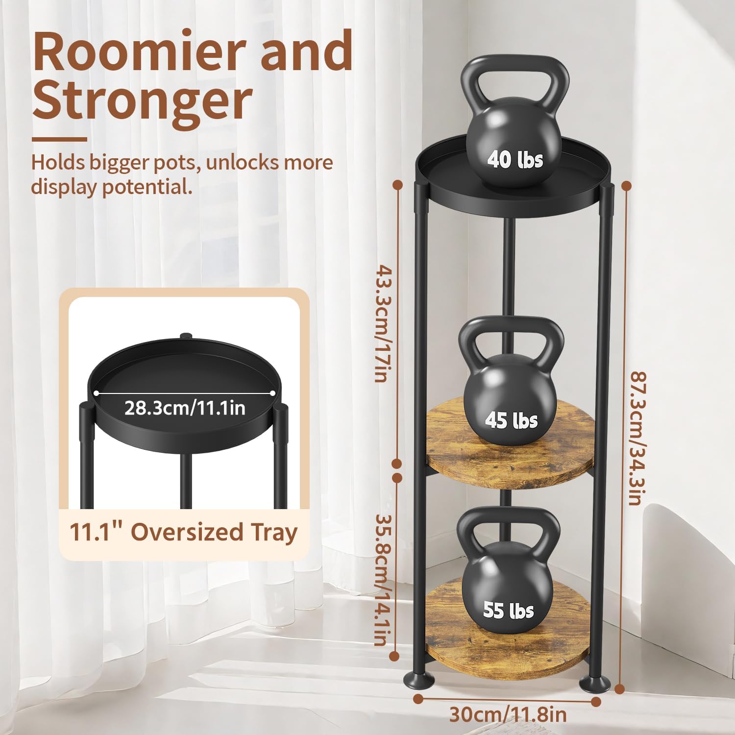 - 【Large Trays for Bigger Plants】The upgraded 11.1-inch wider trays offer more space than most on the market, giving you plenty of space for larger planters. Each tray can hold over 40 pounds, making it a perfect fit for those hefty cement pots that other tiered plant stand just can't handle.