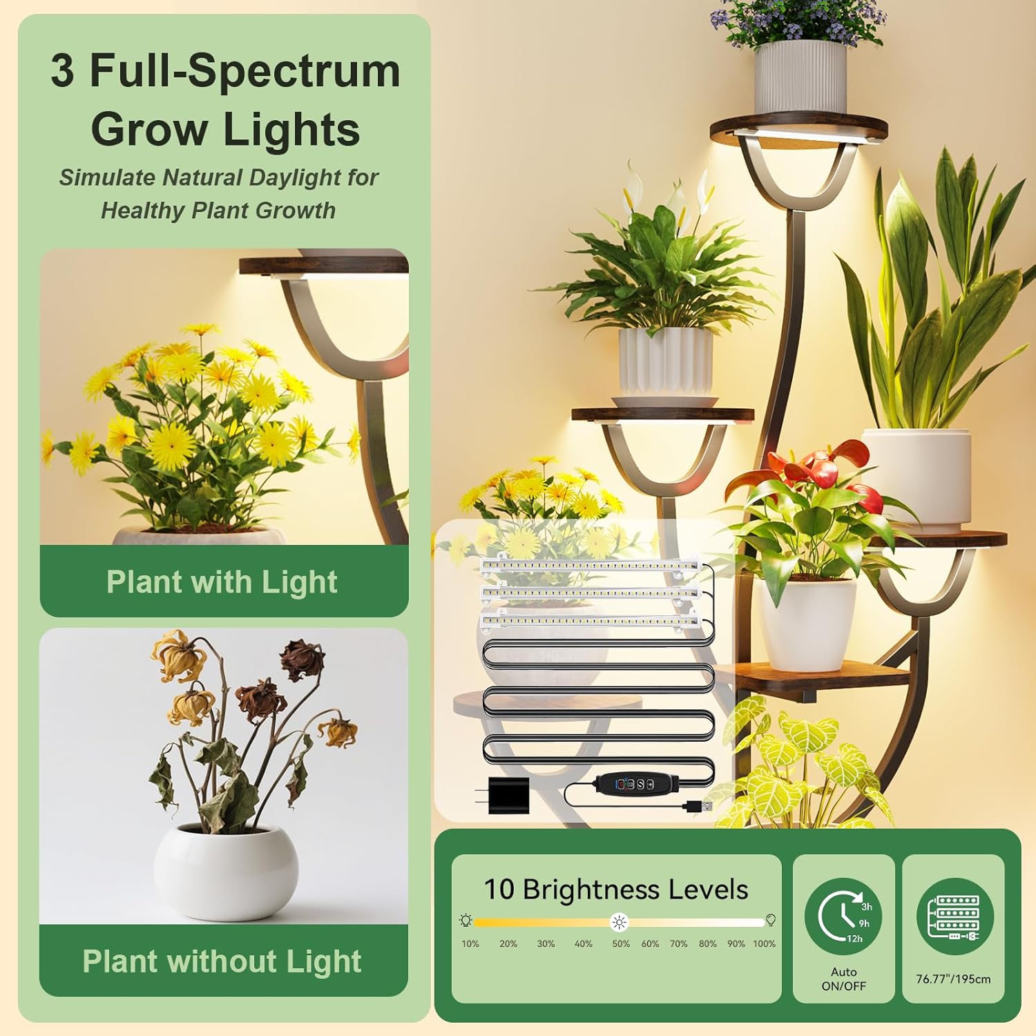 - Plant Stand with Grow Light - This indoor plant stand is equipped with 3 full-spectrum grow lights to support healthy plant growth at every stage, ensures each tier of plants receives ample light. You can place this plant shelf anywhere indoors, no need to frequently move plants outdoors to absorb light.