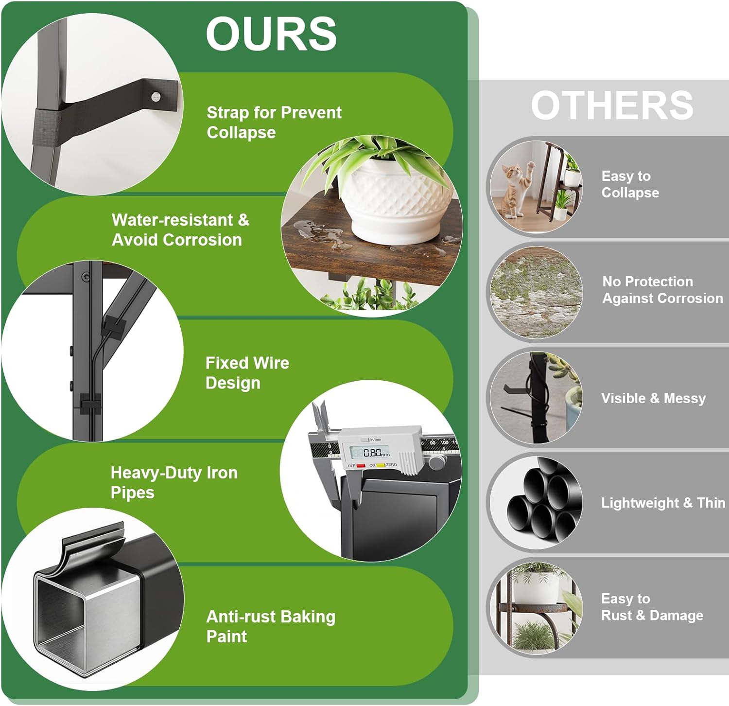 - Stable and Sturdy - The frame of this plant stand is made of heavy-duty iron pipe that is 0.85mm thick, ensuring a robust structure and strong load-bearing capacity. The surface of the iron pipe is coated with special baking paint to avoid rust. The waterproof-coated particleboard shelves resist corrosion, warping, and curling.