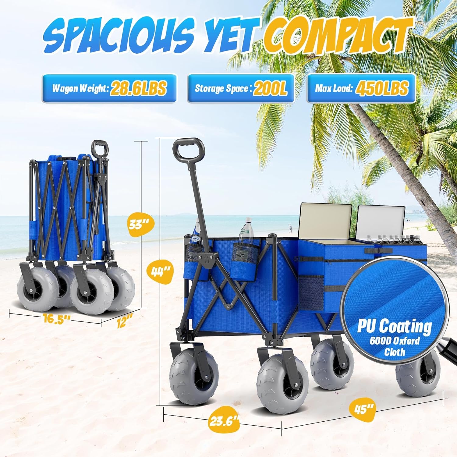 Beach Wagon with Big Wheels for Sand, 450lbs Heavy Duty Folding Wagon, Oversized 200L, 9" PVC All-Terrain Wheels, Adjustable Handle, Cooler & Storage Bags for Beach, Camping, Garden & Outdoor Sports