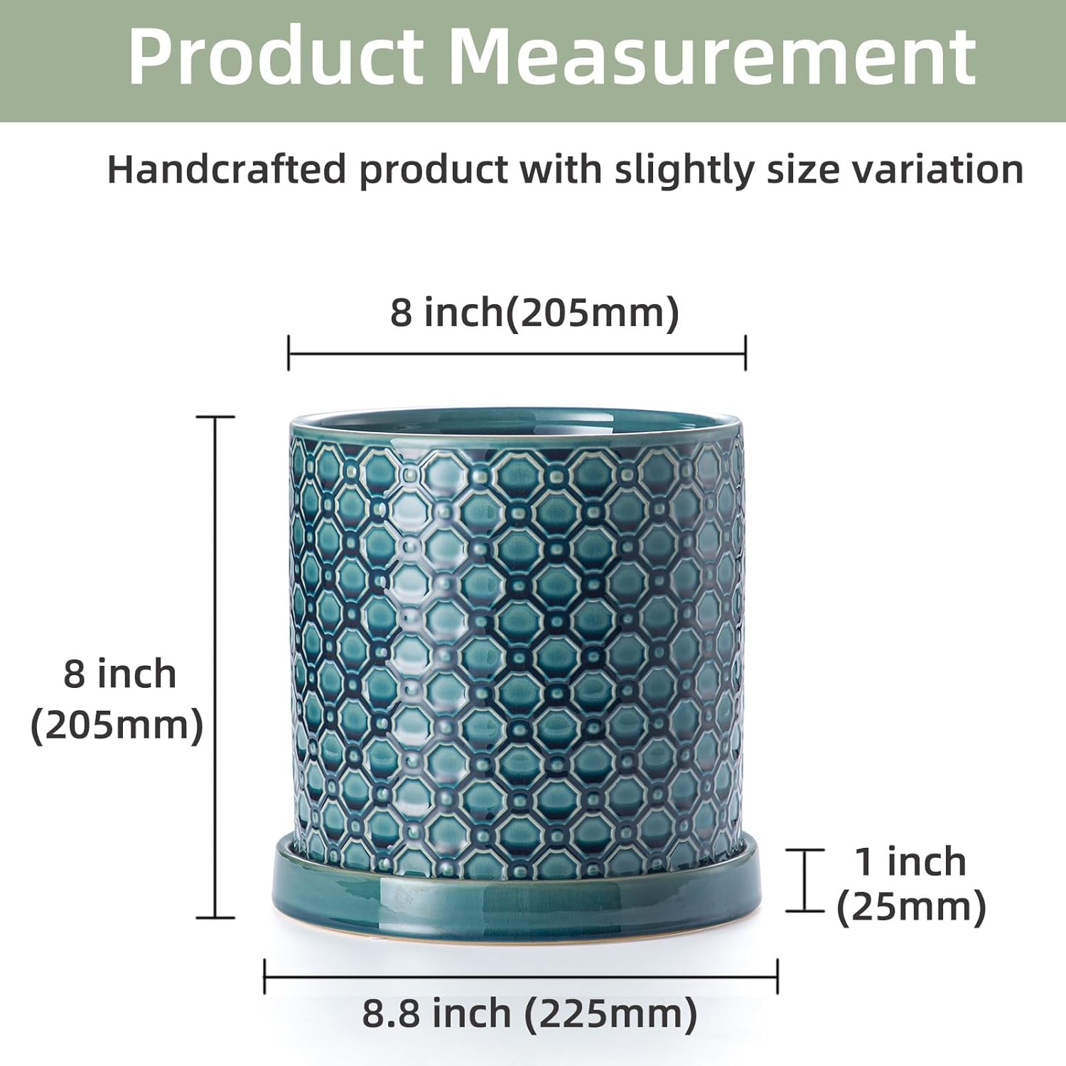8 Inch Plant Pot: Ceramic Planter with Drainage Hole & Saucer Indoor Outdoor Plants - Cylinder Round Flower Pot for Home Office - Modern Decorative - Medium Blue