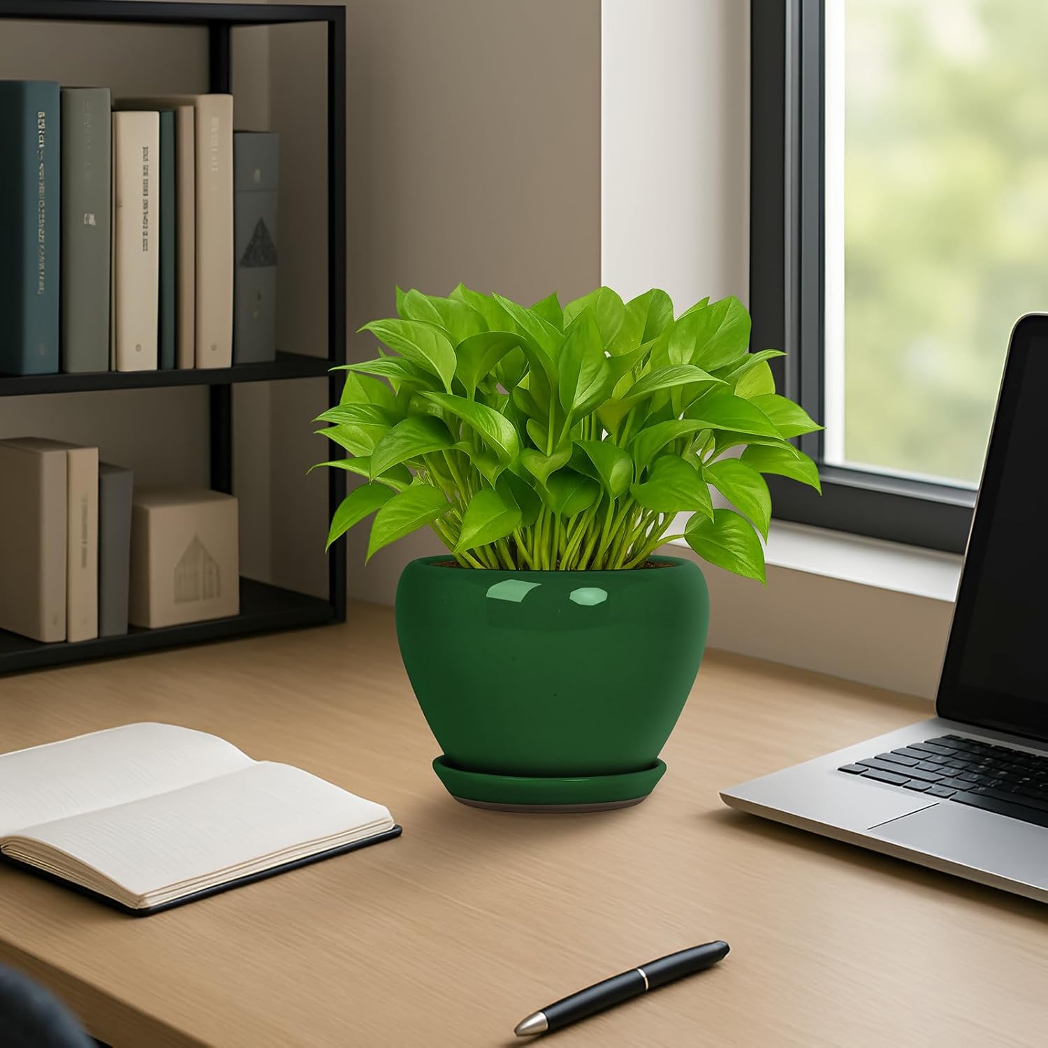 Deep Dream 6 Inch Plant Pots- Ceramic Planter Pot with Drainage Hole and Saucer, Round Flower Pot for Indoor Outdoor Succulent, Snake Plants and Cactus, Green