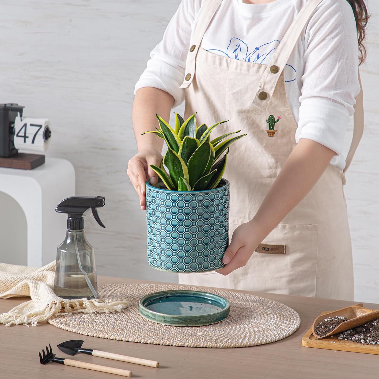 6 Inch Plant Pot: Ceramic Planter with Drainage Hole & Saucer Indoor Outdoor Plants - Cylinder Round Flower Pot for Home Office - Modern Decorative - Small Blue