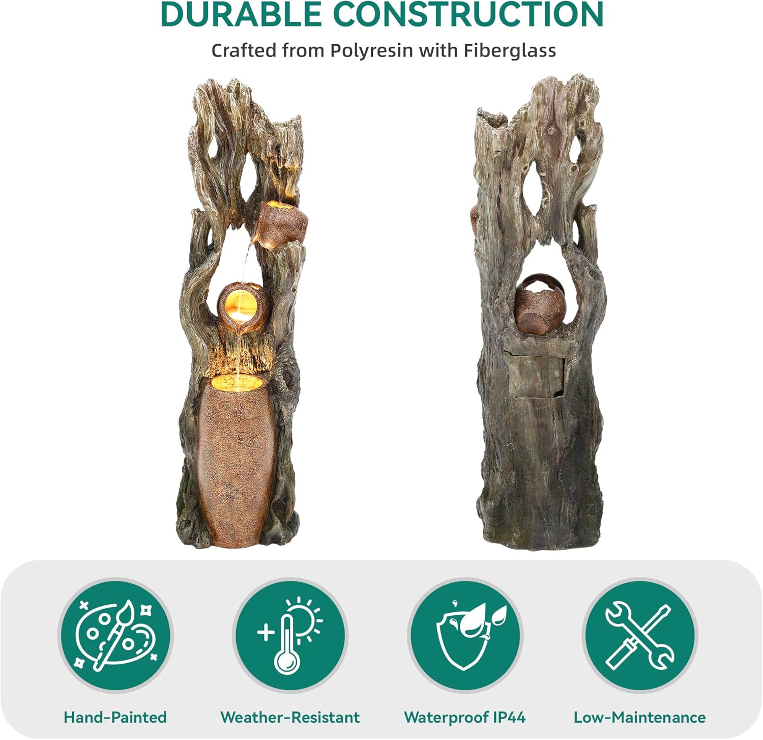 42.7in Tall Outdoor Water Fountain with LED Lights, 3-Tier Rainforest Waterfall Tree Trunk and Jar Garden Fountain, Ideal for Serene Relaxing Patio, Yard or Porch