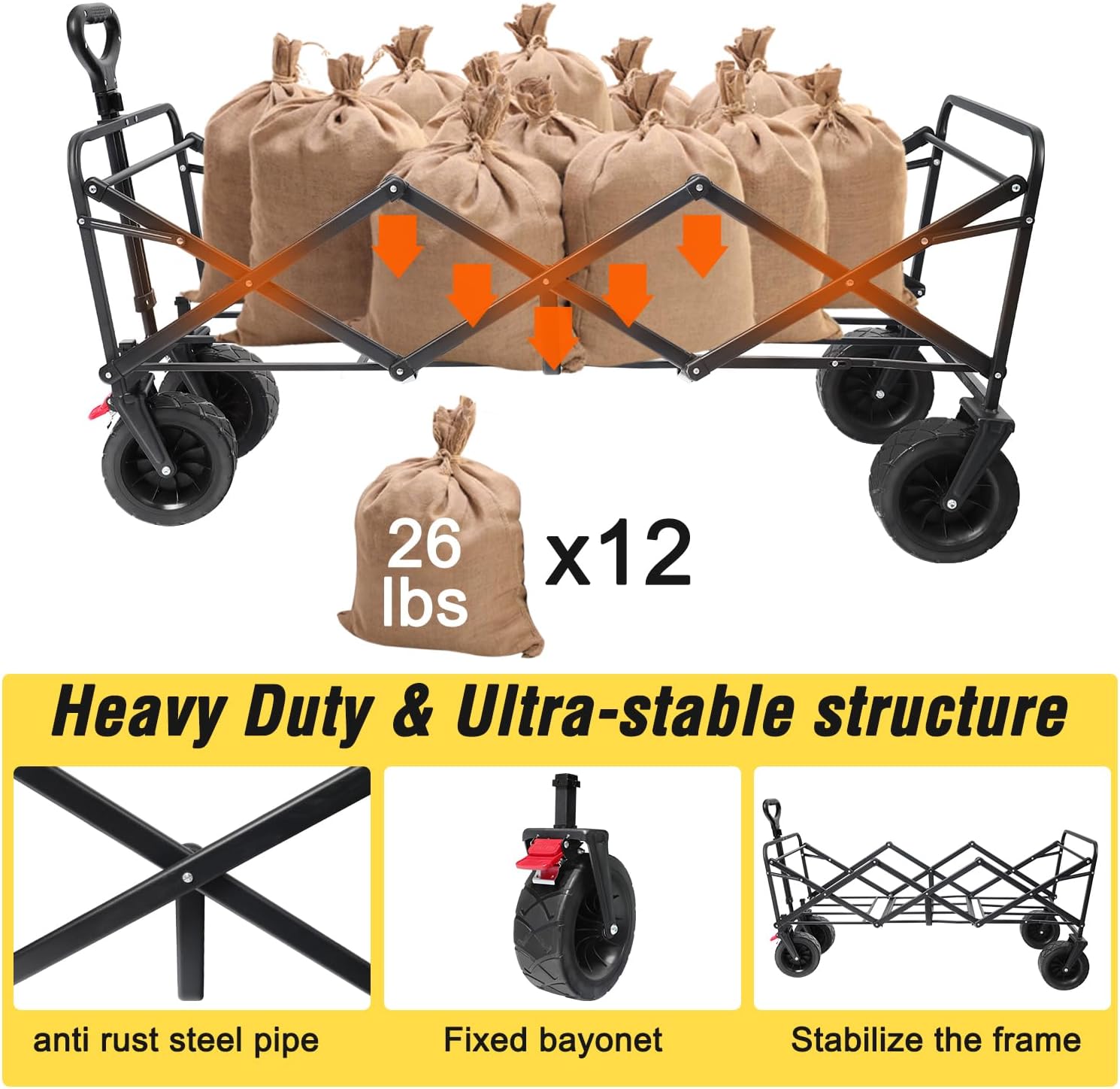 - [Reliable & Smooth Transport] Constructed with a strong steel frame, our collapsible wagon could transport up to 200 lbs. All-terrain wheels' built-in double bearings ensure smooth pull and easy transport on multiple ground surfaces