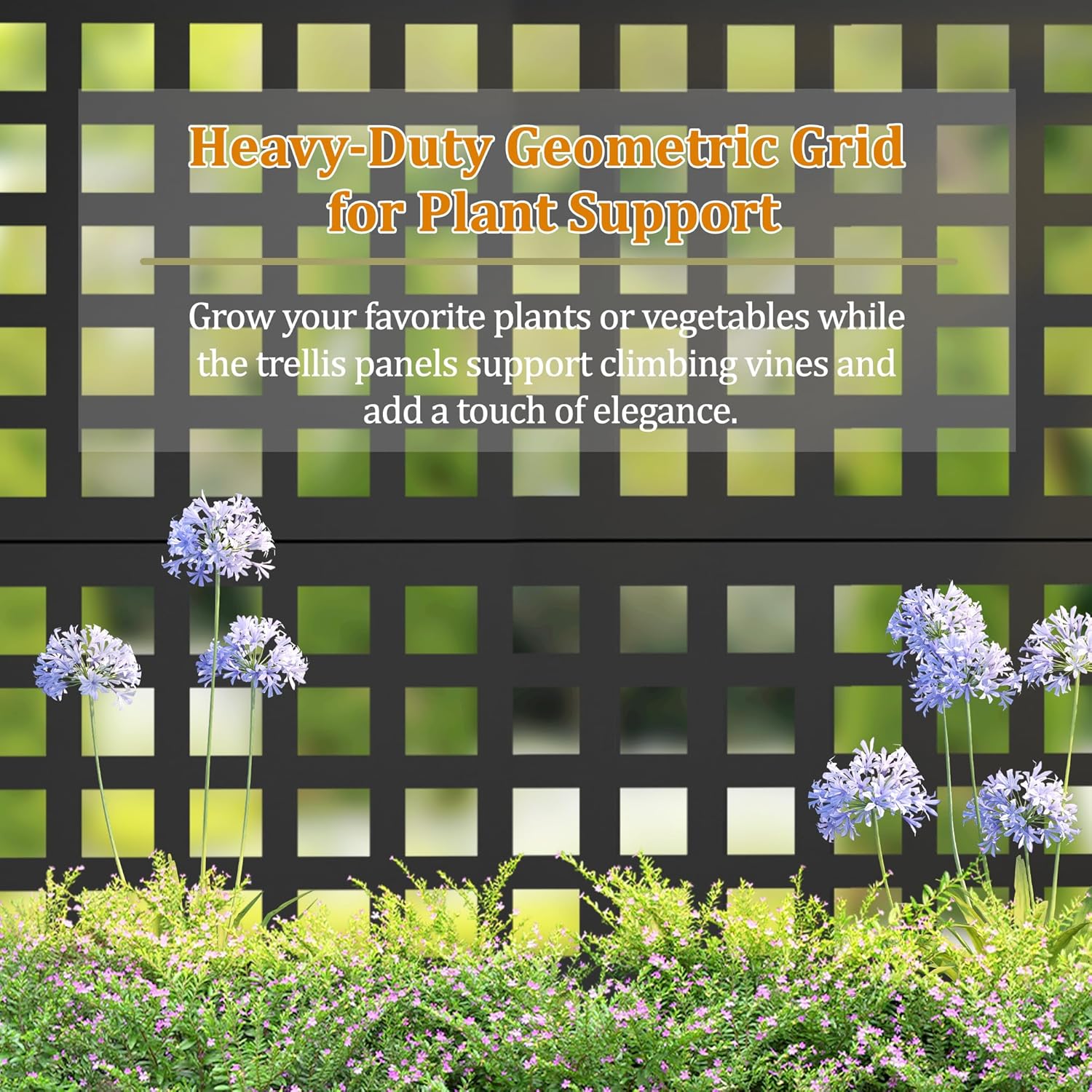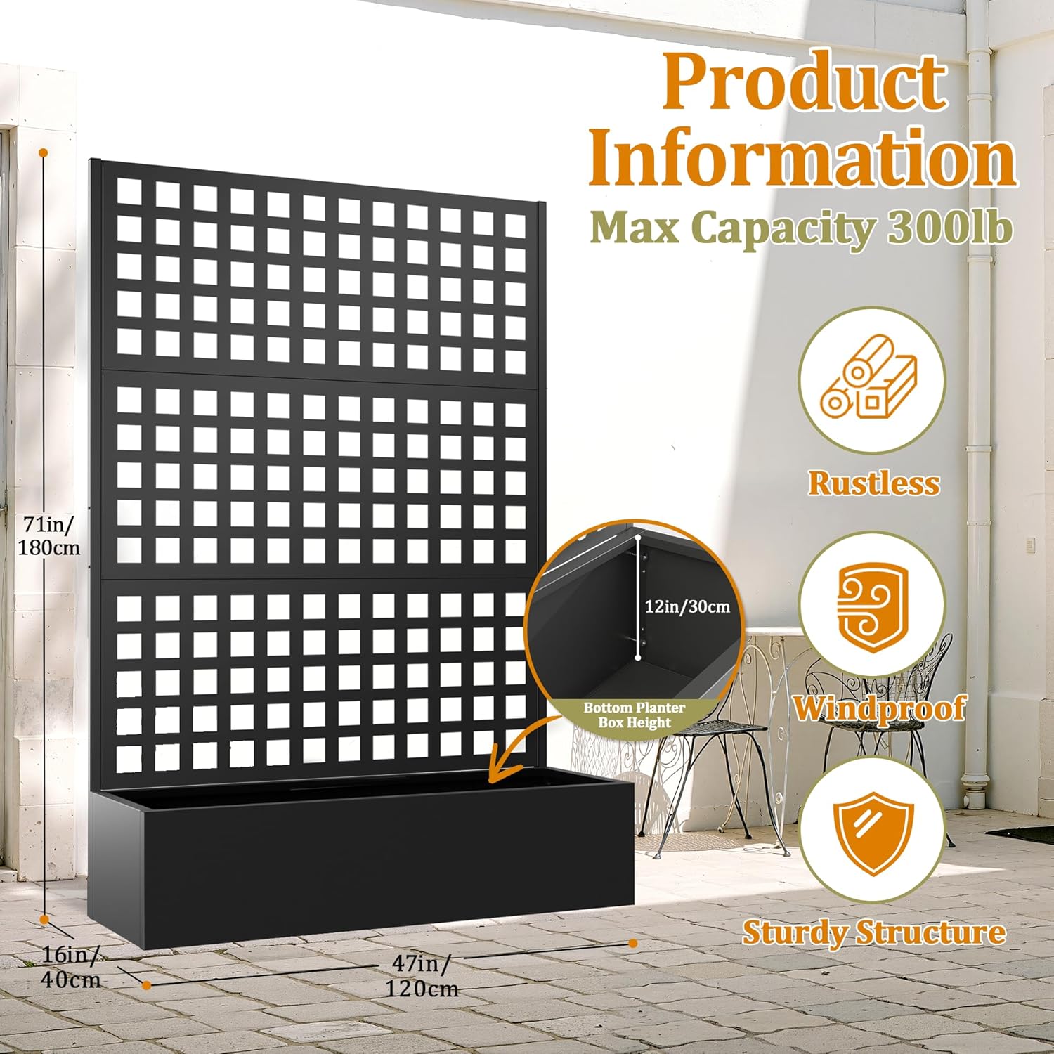 - đ§ăSpacious and Efficient Planting AreaăEnjoy abundant space in this metal planter box with trellis, ideal for vegetables, herbs, and climbing flowers. Drainage holes prevent waterlogging, making it a perfect garden raised bed for climbing plants. With its vertical structure, this metal planter with privacy screen allows you to grow upward, saving ground space. Plus, this metal planter box with trellis is great for small patios or urban gardens.