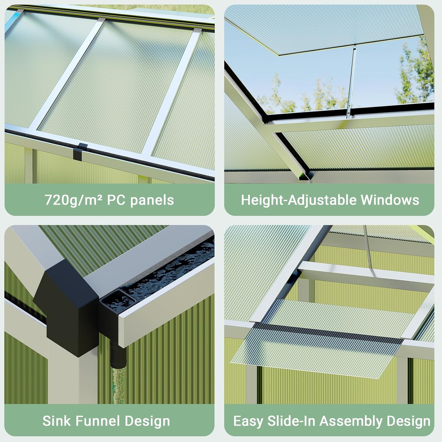 - 【Effortless Assembly】Create your beautiful gardening space quickly with our greenhouse kit. The package comes with a clear instruction manual and all the necessary tools, making setup straightforward. Our slide-in PC panels make assembly 40% faster and 35% more secure than conventional methods. Save time and effort while building a reliable and sturdy outdoor greenhouse.