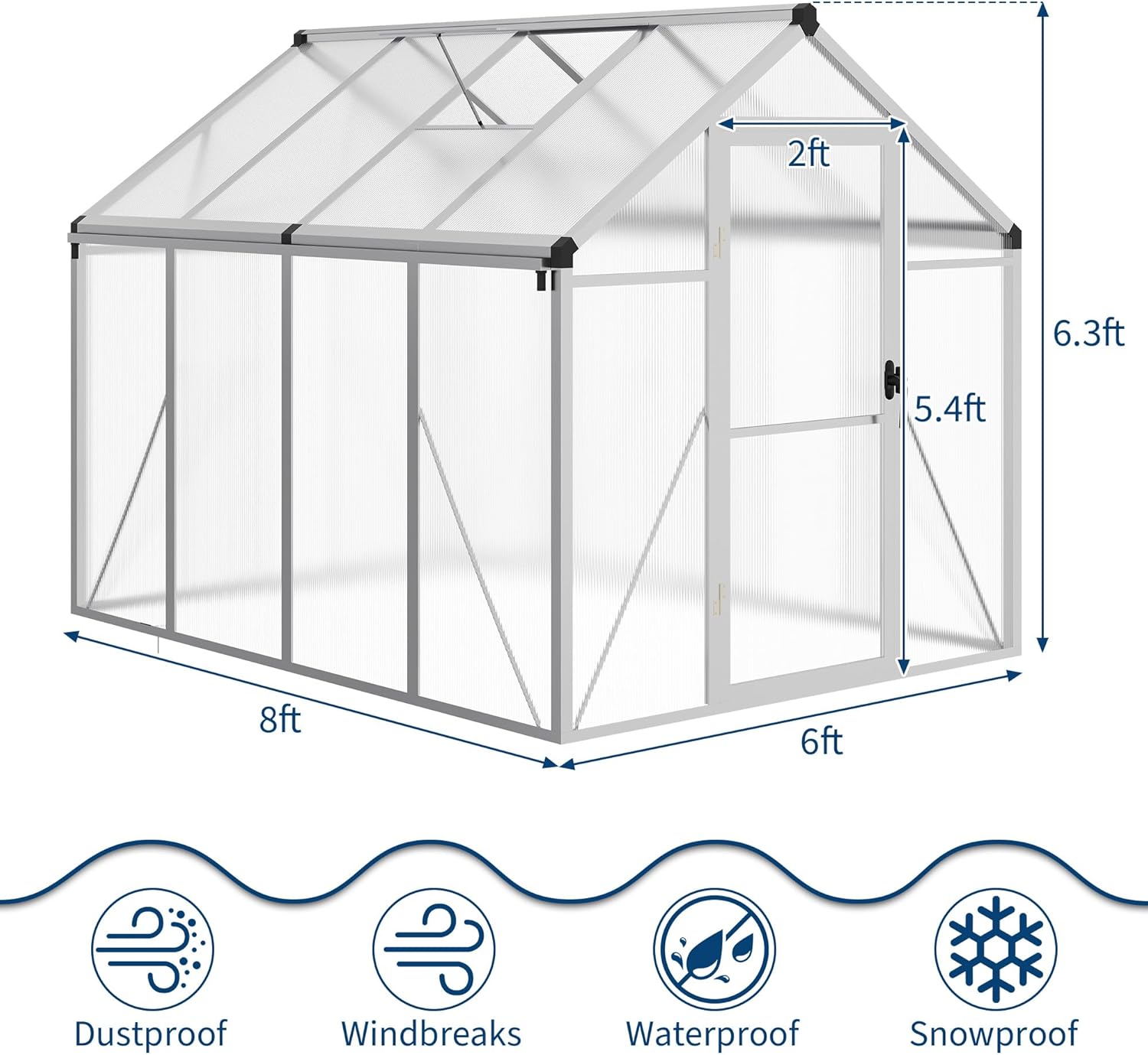 - 【Resilient Construction】Designed to endure challenging weather, our greenhouse features 720g/m² polycarbonate panels and a solid aluminum steel frame. This design ensures stability and protection during heavy rain and gale. Keep your plants safe and thriving in a reliable greenhouse built to last.