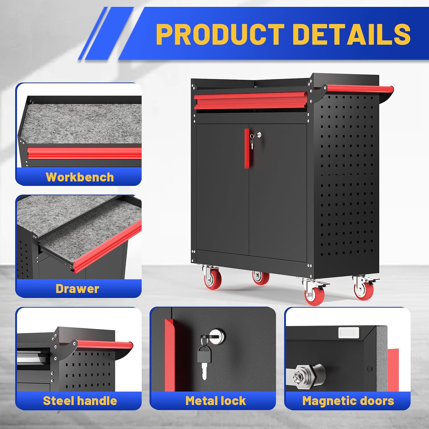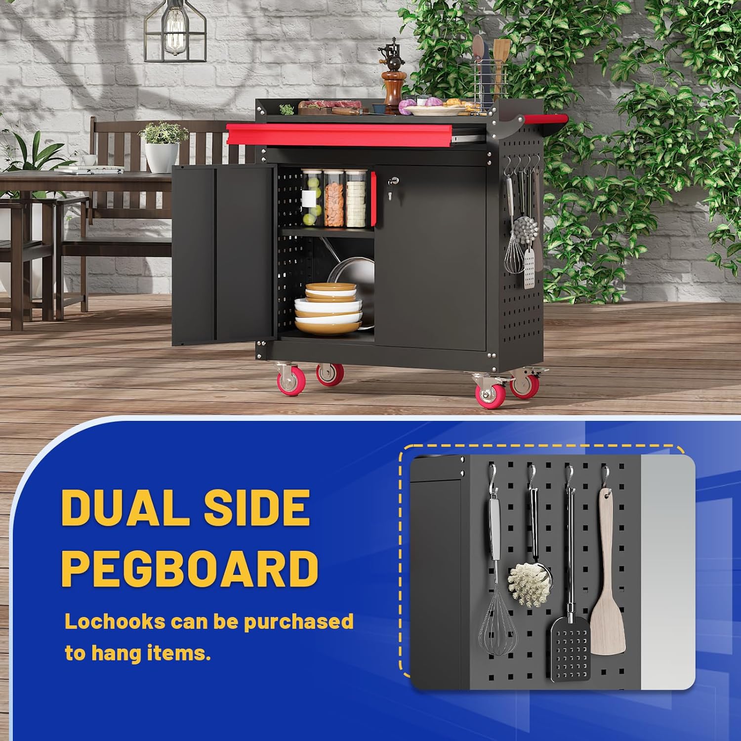 - 【Ample Storage Space】The top tray of the outdoor grill table is the perfect grill side table for dinner plates and tools, providing you with ample placement area next to the grill. Outdoor grill cabinet has a dedicated slide-out drawer for easy on-the-go access to utensils, napkins and condiments. The lockable two-door cabinet (with magnetic doors) provides plenty of space for storing propane tanks or charcoal bags in a safe and secure manner. The pegboard design on both sides of the grill carts allows for hooks to hang paper towels and tools. It also provides ventilation.