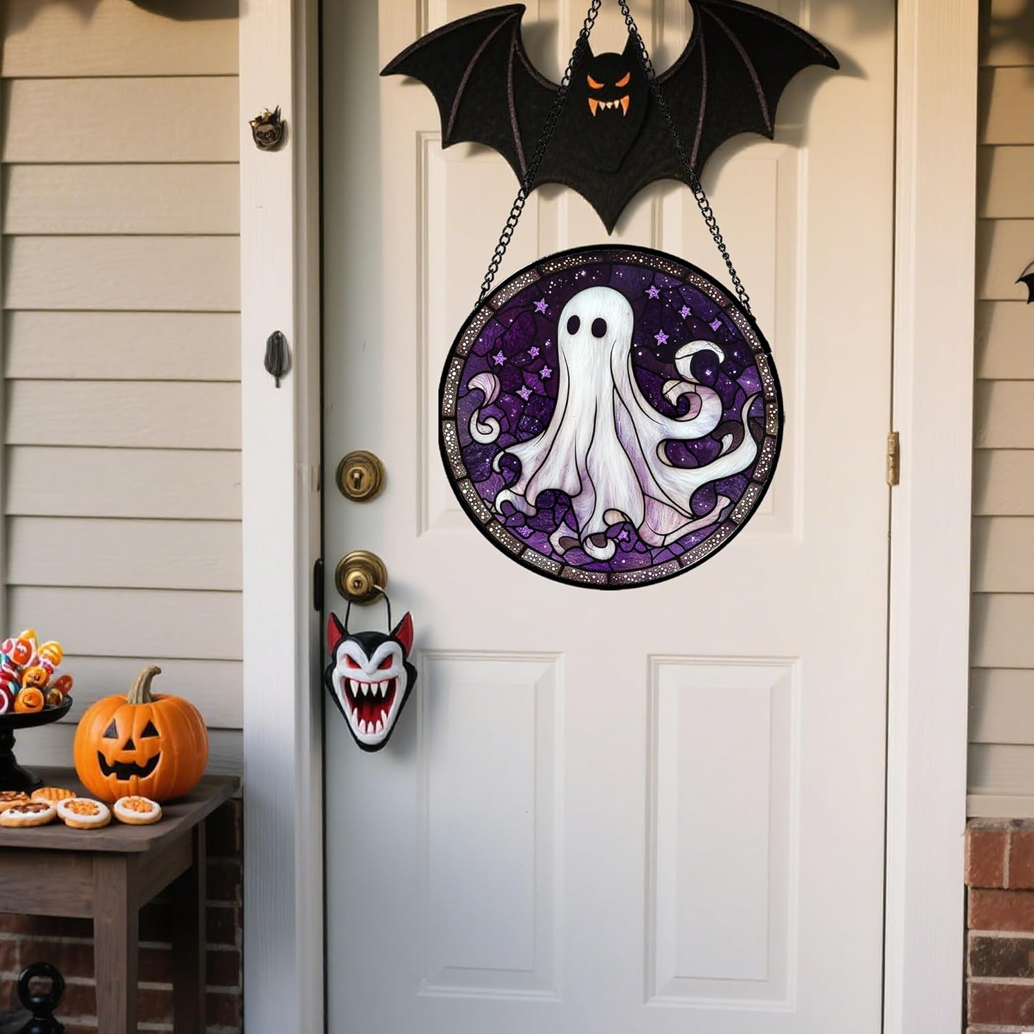 Stained Glass Window Hanging - Halloween Decorations White Ghost Purple Stars Suncatcher for Doors Garden Spooky Funny Sun Catchers Gothic Decor Horror Gifts for Women Men Friend 11.8 in