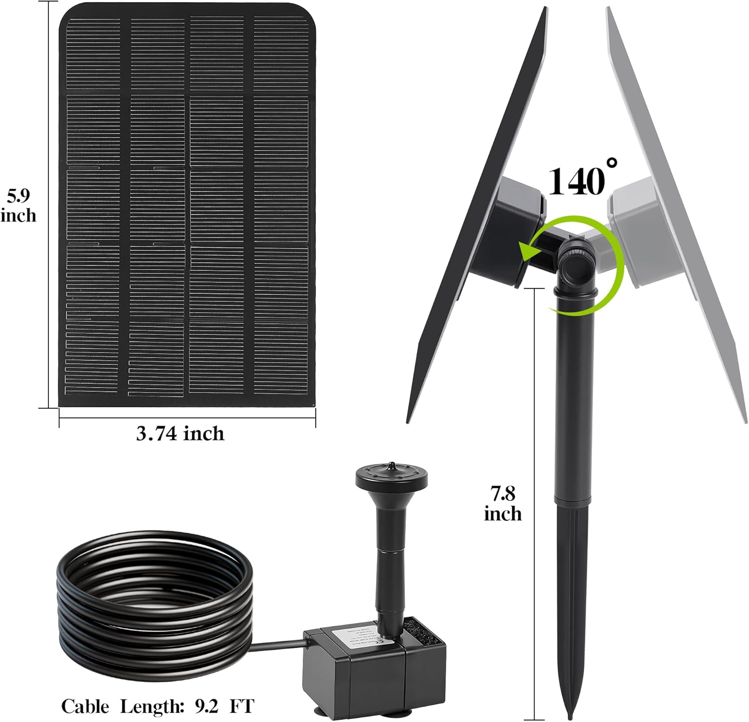 - The solar water fountain kit includes 1 adjustable solar panel, 1 water pump with 9.54FT power cable, 5 spray nozzles,3 nozzle connectors and 1 solar panel stake