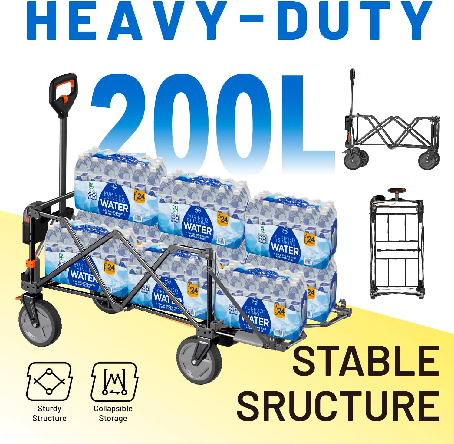 - 【Massive Storage – Haul Everything You Need】 Boasting a 200L capacity and a reinforced tailgate, this utility cart fits tents, fishing rods, groceries, or picnic supplies with ease. It supports up to 300 lbs—ideal for family outings, garden tools, or shopping hauls. Bring more, carry less effort.