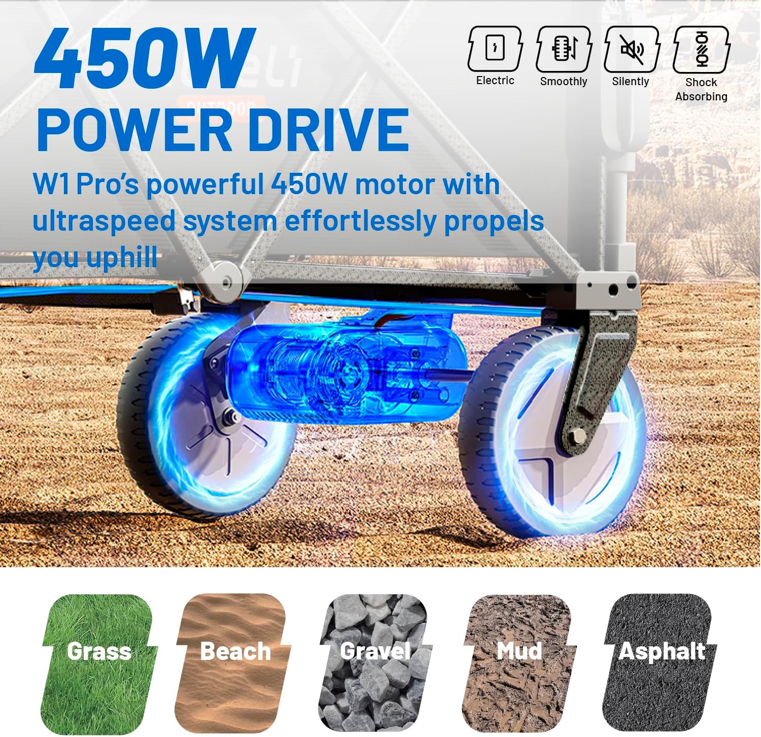 - 【Effortless Power Drive – Say Goodbye to Heavy Lifting】 Equipped with a robust 450W motor, this electric camping wagon effortlessly climbs slopes and tackles heavy loads—just press the button and let it roll. Whether you're heading uphill to a campsite or across sandy beaches, the powerful motor does the work for you.