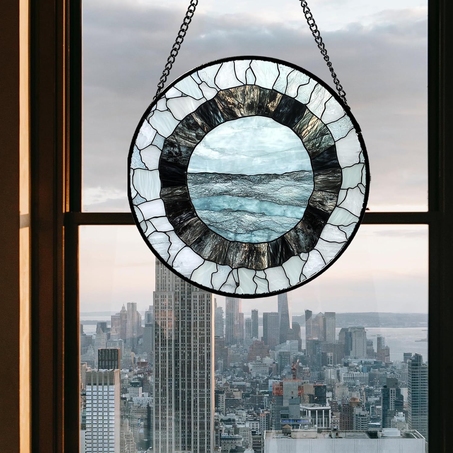 Stained Glass Window Hanging - Abstract Sea Surface Suncatcher for Doors Garden Patio Round Sun Catchers Decor Christmas Mother's Day Birthday Gifts for Women Men Mom Nana Friend 6.3 in