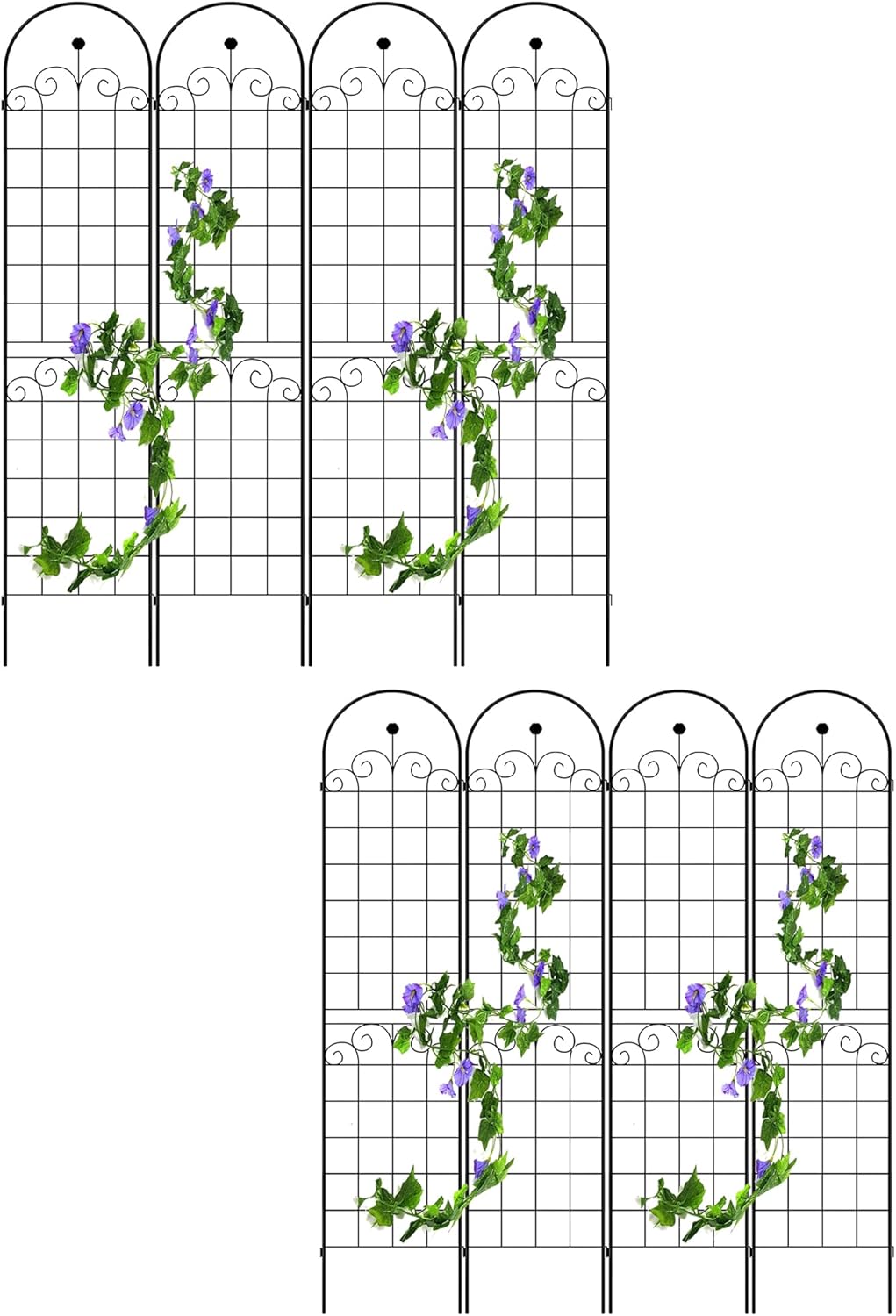 8 Pack Metal Garden Trellis for Climbing Plants, 86.7" Tall Rustproof Outdoor Trellis Panel w/Curly Grass Design, Decorative Black Iron Plant Support for Vine, Rose, Flower, Garden Wall