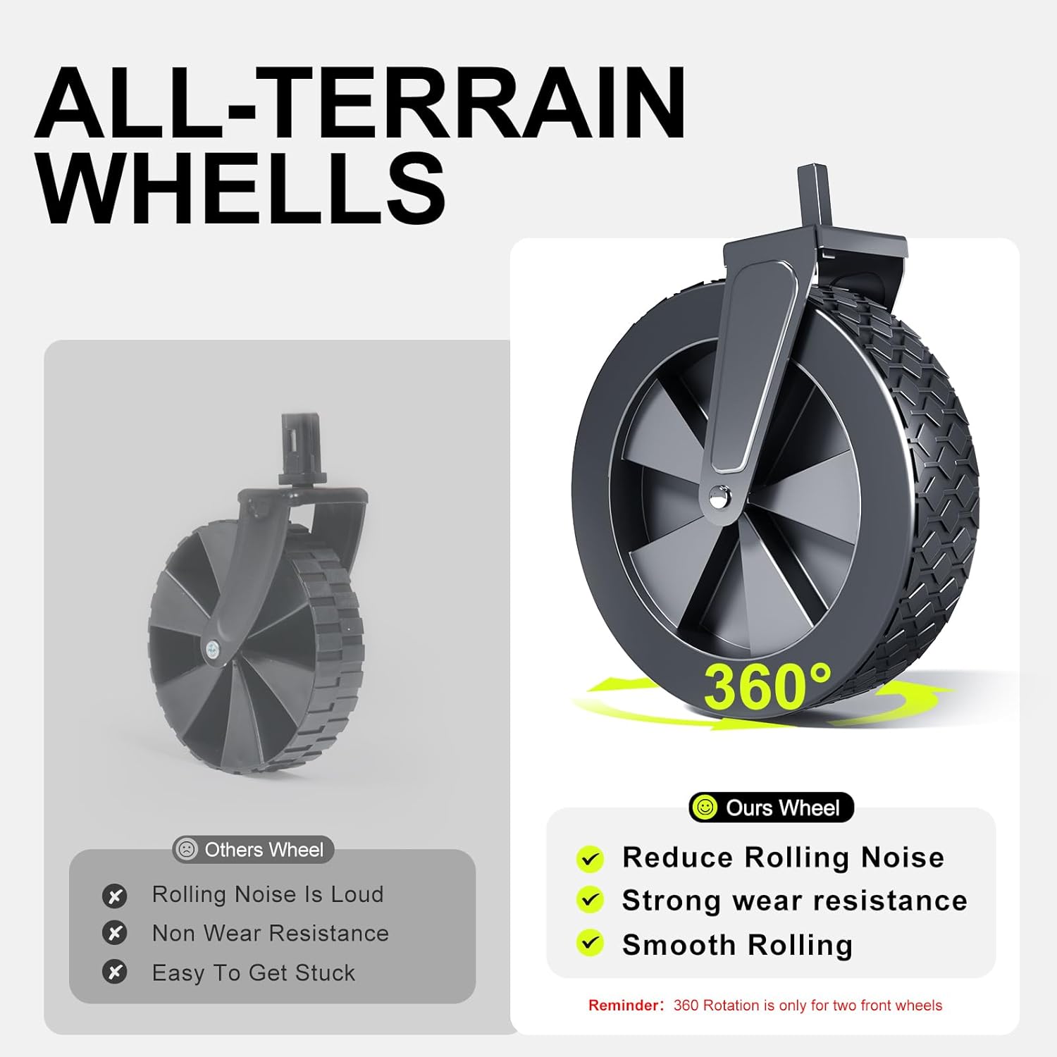 - 【Smooth Rolling & Adjustable Handle】The portable collapsible wagon is equipped with 360°swivel wheels (only two front wheels) that can rotate freely for easily maneuvering in any terrain and move smoothly and go where you want to go. The handle design of the camping wagon has an automatic rebound function to prevent tripping and adjust the height and angle according to your own needs