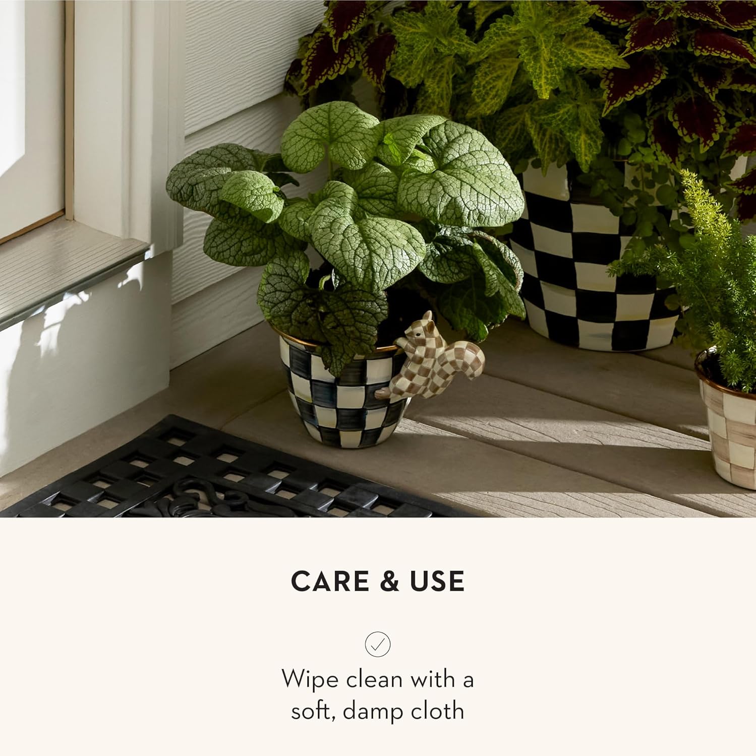 - ELEGANT OUTDOOR DECOR: Bring a touch of whimsy to your house planters and flower pots with our Mocha Check Squirrel figurine. This miniature piece of art is hand-painted with warm brown-and-white checks that complement natural foliage.