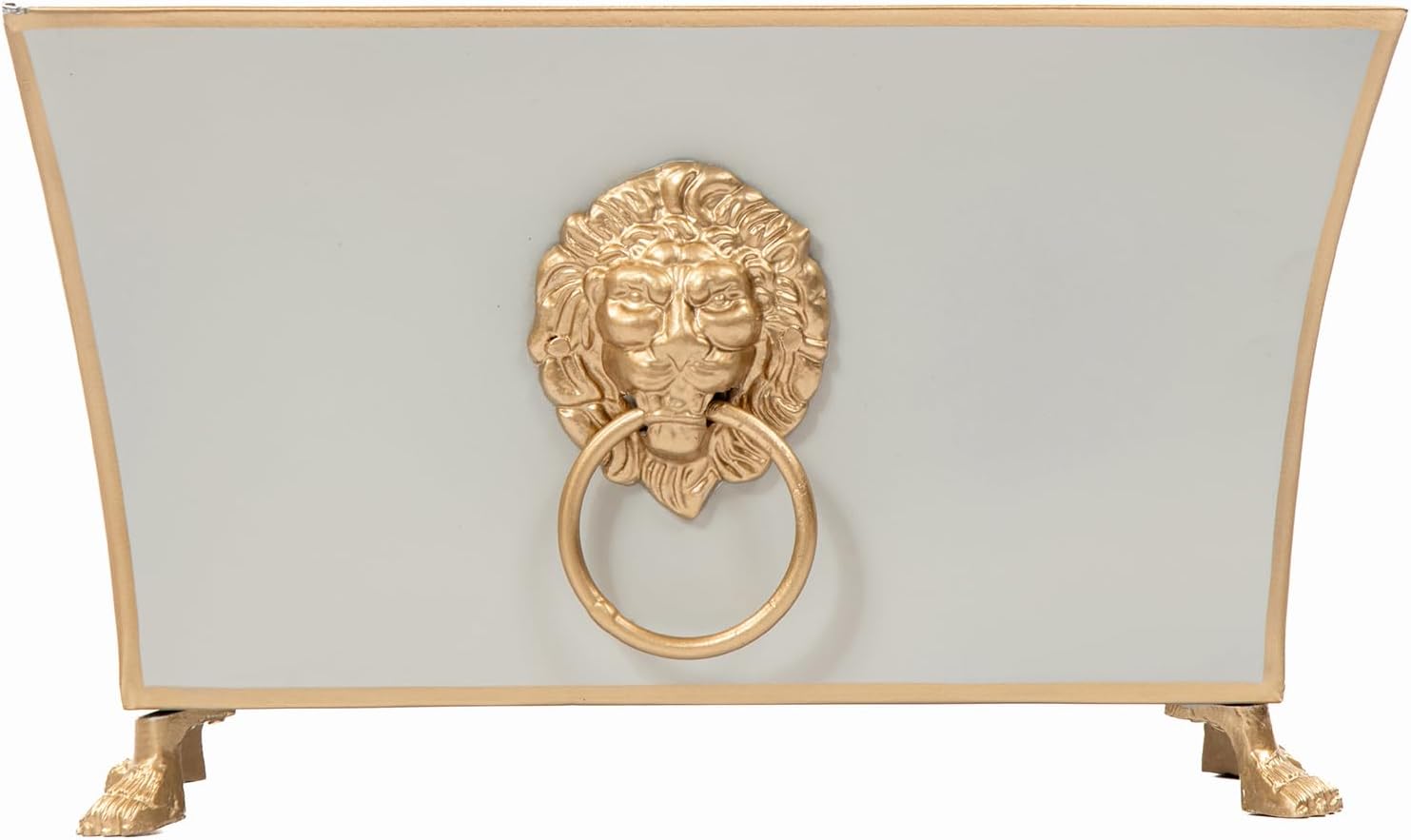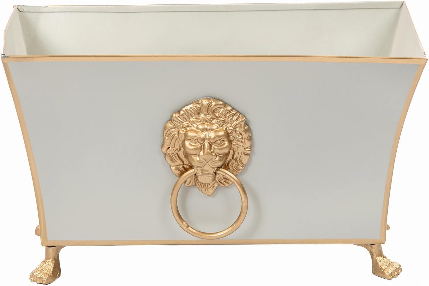 - Hand-Painted Metal Decor with Gold Detailing | This taupe metal decor piece is crafted from hand-painted metal and features decorative claw feet and a gold lion head ring—ideal for enhancing planter decor on vanities or bookshelves.