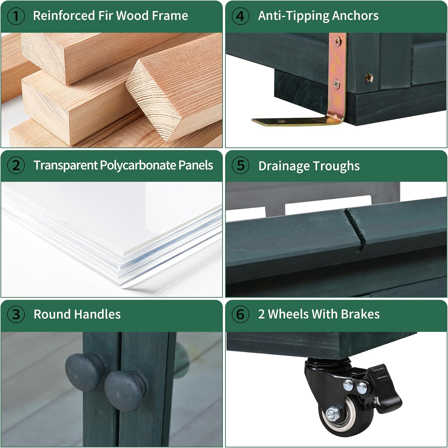 Merax 69" Wooden Greenhouse with Wheels - Portable Cold Frame for Balcony/Patio, UV-Resistant Indoor Outdoor Plant Growing Cabinet (Large, Heavy-Duty) (Forest Green)