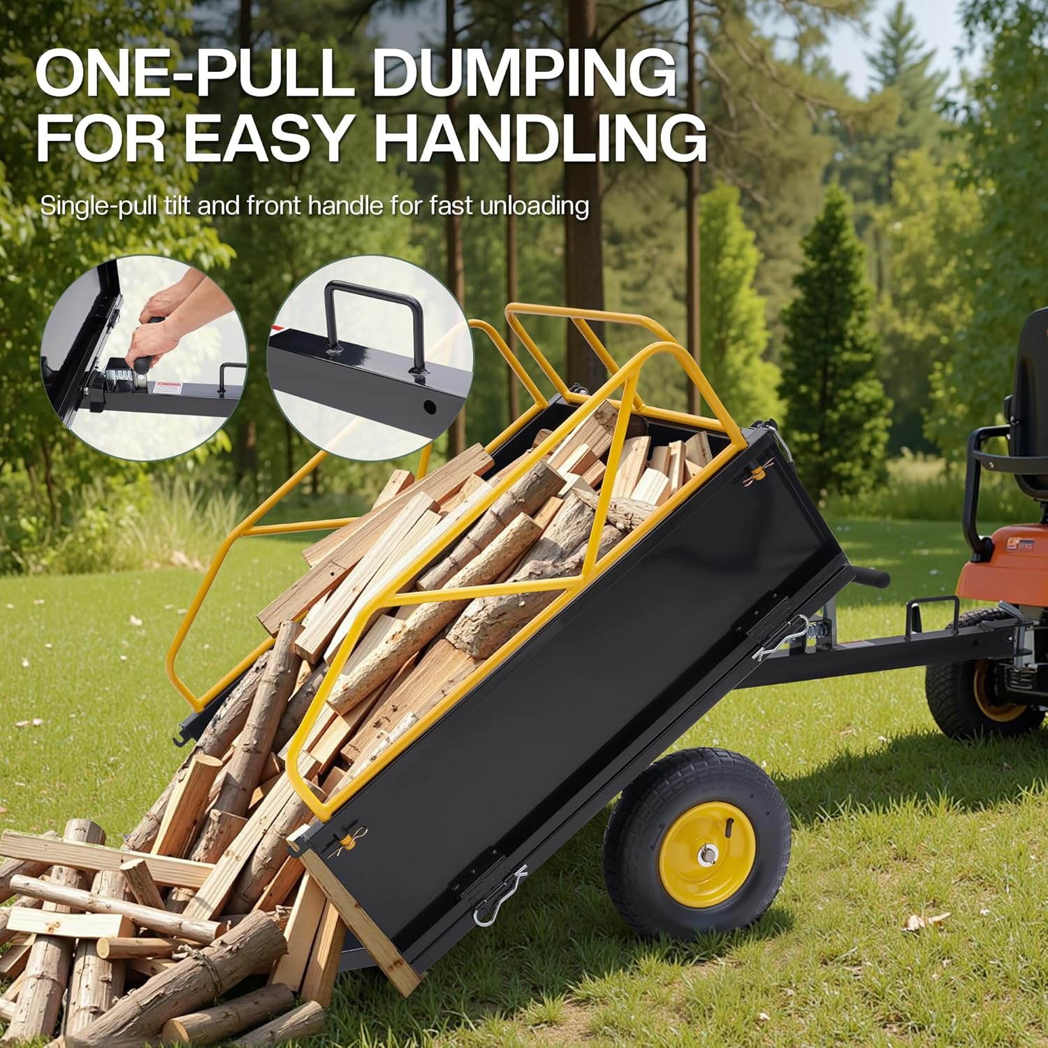 - One-Pull Dumping: The yard trailer unloads with a single pull. A front handle offers easier hookup and maneuvering—ideal for solo users working in large yard areas