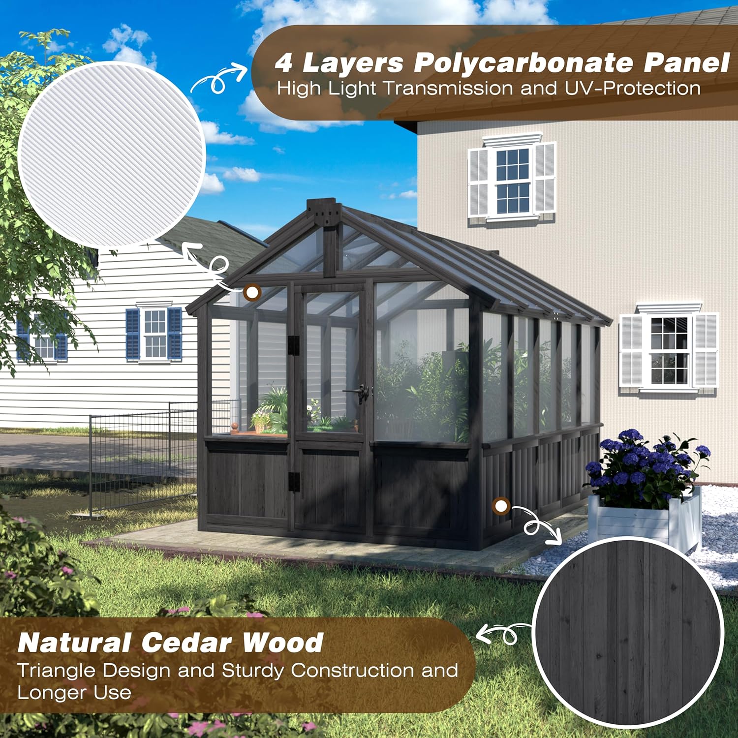 6x10 FT Greenhouse Kit for Outdoor, Thickened Polycarbonate Panel Wooden Walk-in Green House with Lockable Door and Adjustable Roof Vent, Backyard Garden, Black
