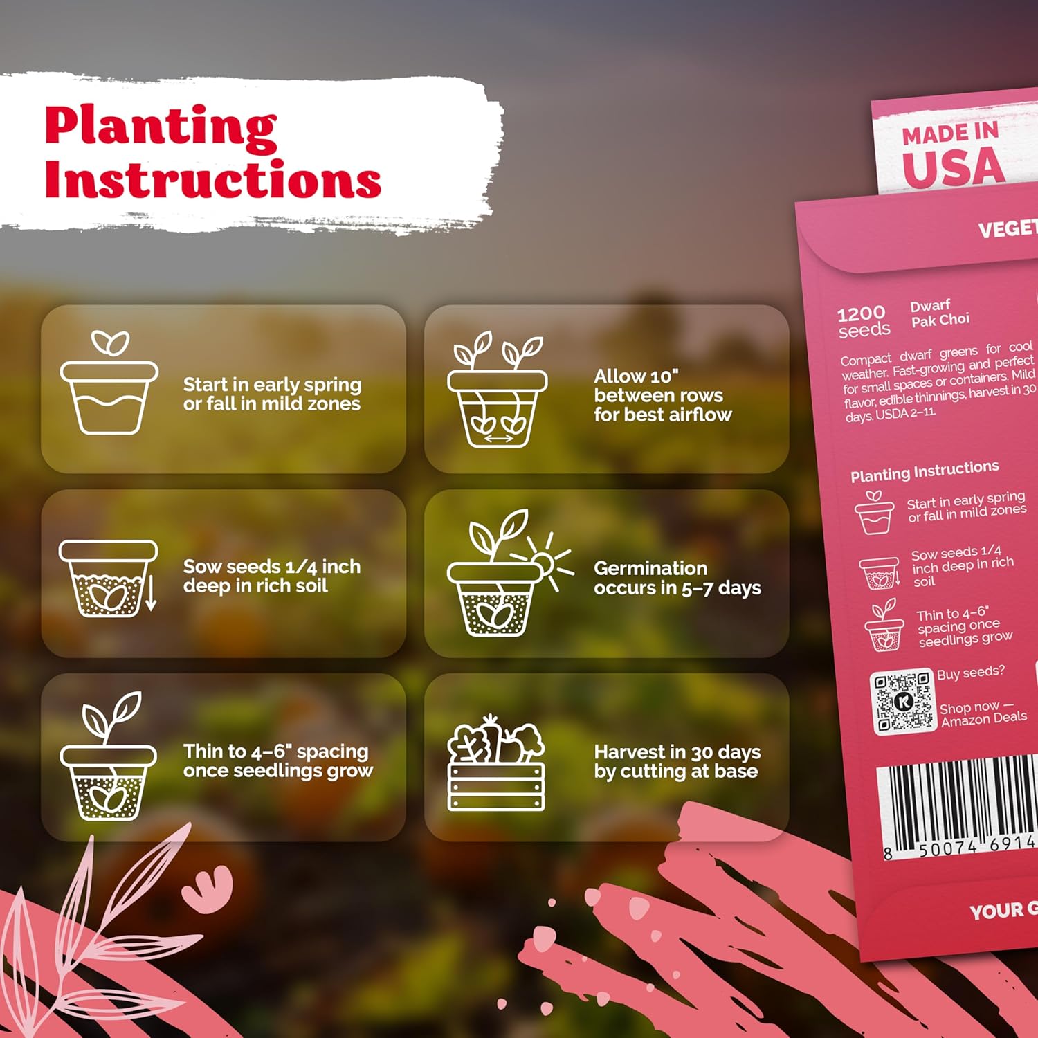 - Compact Growth: Dwarf bok choy seeds make 2-4 inch heads ideal for containers, raised beds & outdoors. Plant these organic vegetable seeds to harvest bok choy fresh - dark green leaves & white petioles, supplying mild crunch for asian meals.