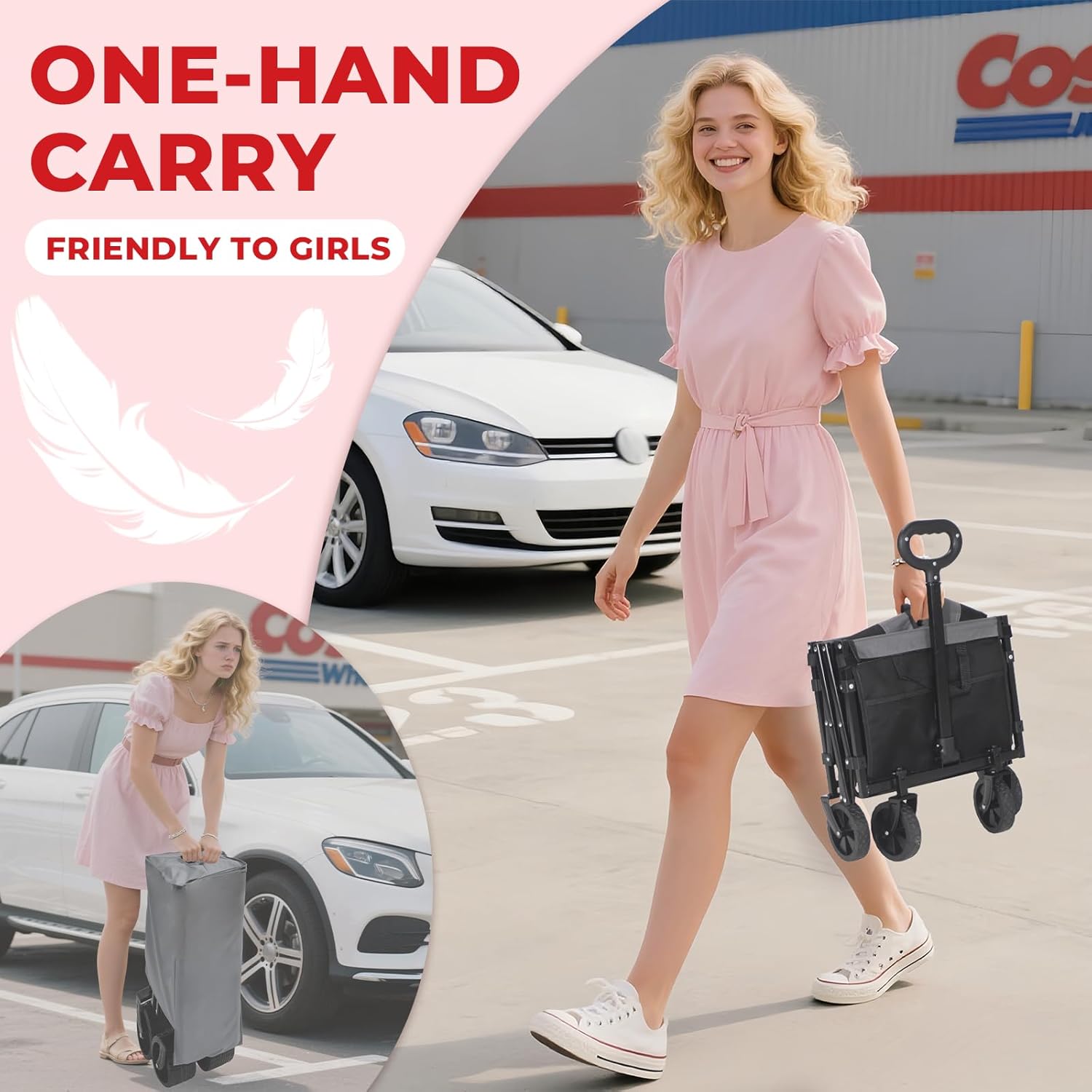 - Ergonomic Telescopic Handle With Easy Grip:Adjustable pull handle offers a secure, comfortable grip to reduce wrist strain. Push or pull this folding utility wagon easily—even when fully loaded for groceries, beach days, or camping trips