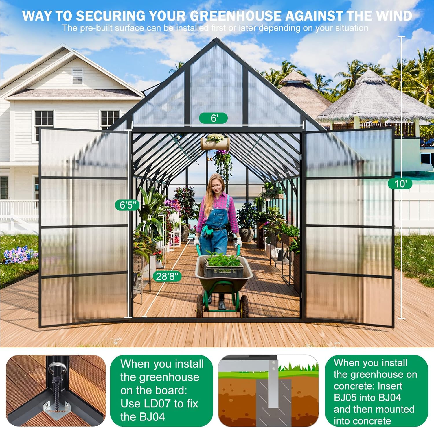 - Exceptional Stability: For extra stability, you can bury the base feet in soil or concrete, or use our matching screws to secure the base to the board. Both of our ways of securing the base enhance resistance to snow and wind. 10x24 FT: the overall dimensions are 336.8"L x 123"W x 119.4"H.