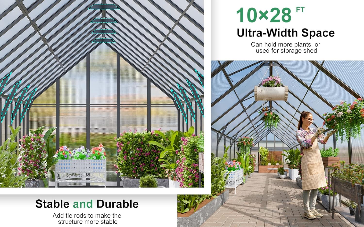 - Durable Panels: These 4mm twin-wall polycarbonate panels are nearly unbreakable. They allow 70% light transmission for optimal plant growth while blocking over 99.9% of harmful UV rays. Perfectly sized for your backyard, terrace, or garden, this greenhouse is great for casual gardeners and flower enthusiasts, providing ample space for plant preparation and growth.