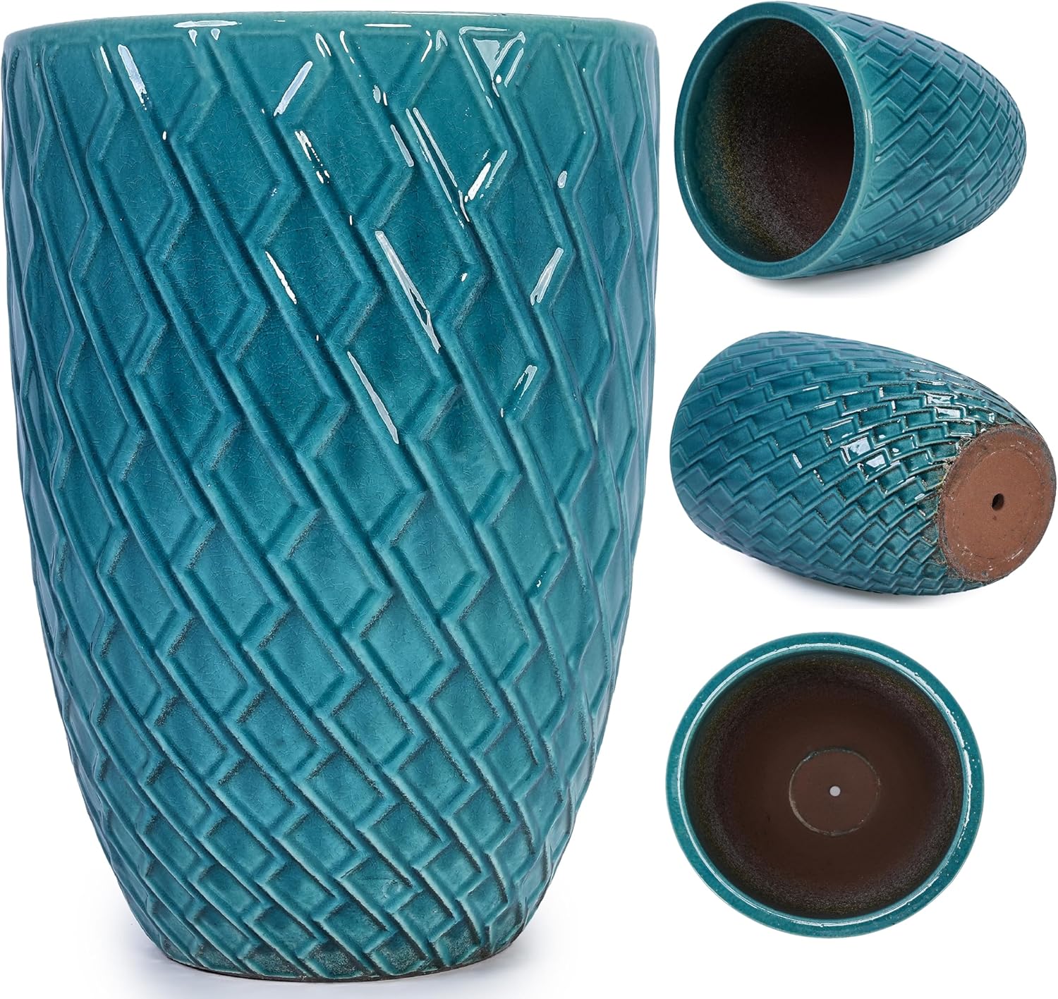 Large Ceramic Planter Pot 21 Inch, Tall Plante Pots Decorative Flower Pot with Diamond Textured Pattern and Drainage for Indoor Outdoor Plants (Teal Blue)