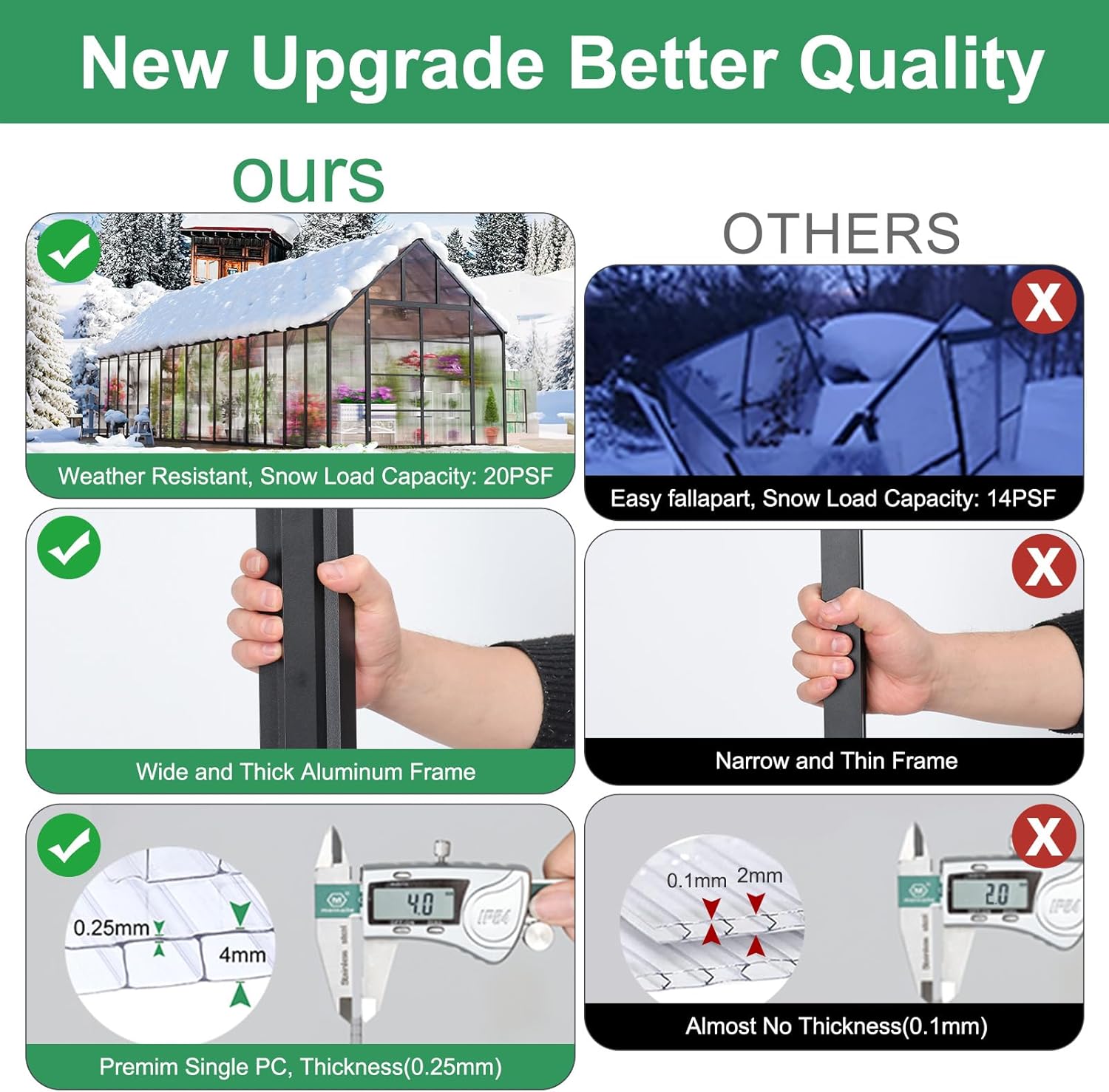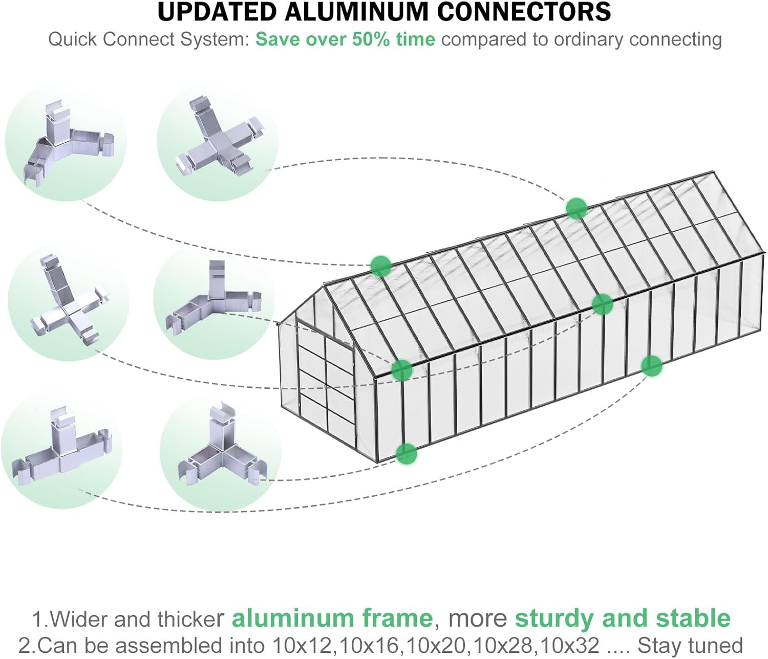 - Sturdy Frame: Our greenhouse kit boasts a robust rust-resistant aluminum frame designed to withstand various weather conditions. Introducing patented technology, Easy assembly, saving you 50% of your time. Gone are the days of tedious setups. With a simple push and locking screw, our Quick Connect ensures a reliable, secure, and swift link-up. It can also support snow loads of up to 20PSF.