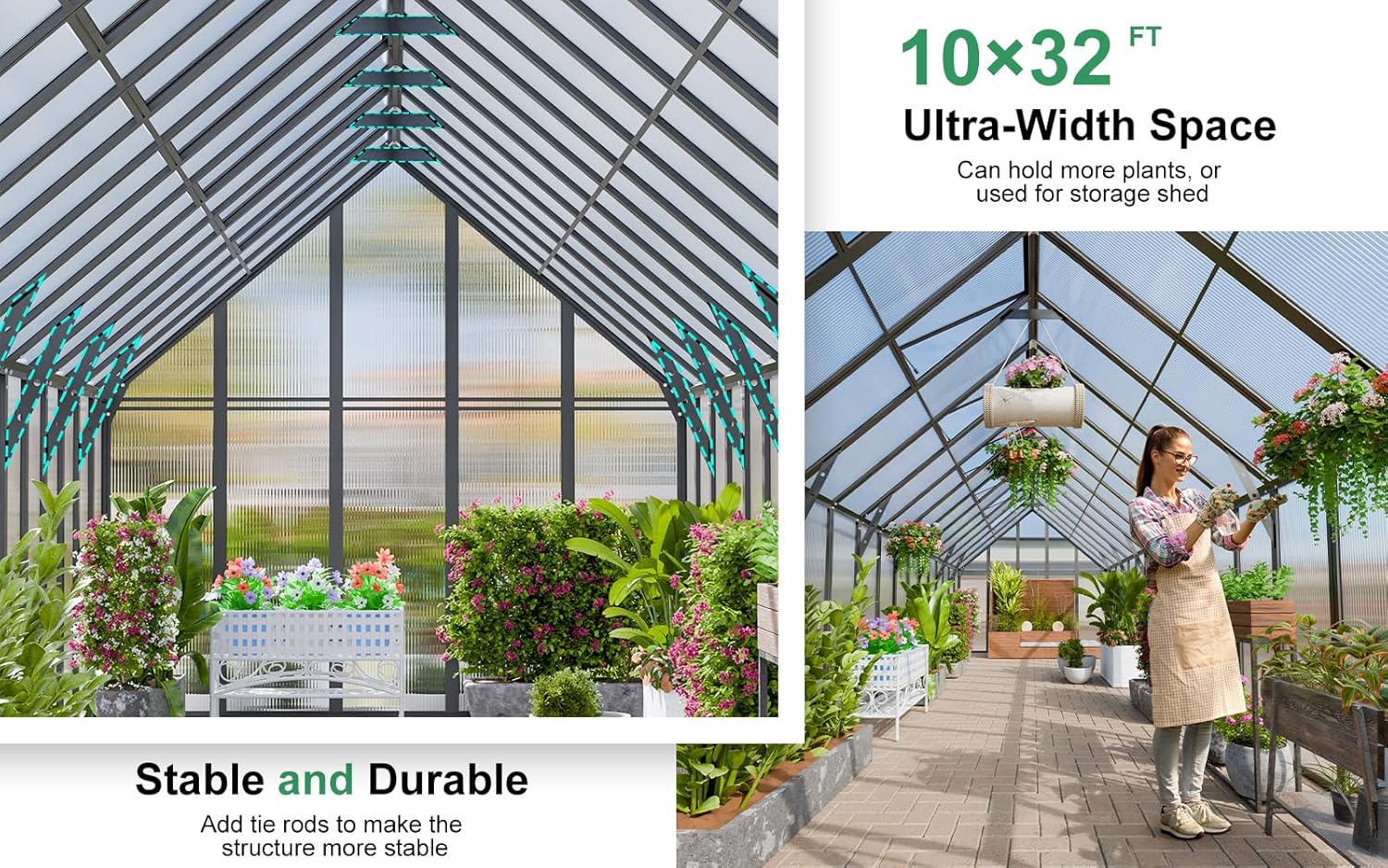 - Durable Panels: These 4mm twin-wall polycarbonate panels are nearly unbreakable. They allow 70% light transmission for optimal plant growth while blocking over 99.9% of harmful UV rays. Perfectly sized for your backyard, terrace, or garden, this greenhouse is great for casual gardeners and flower enthusiasts, providing ample space for plant preparation and growth.