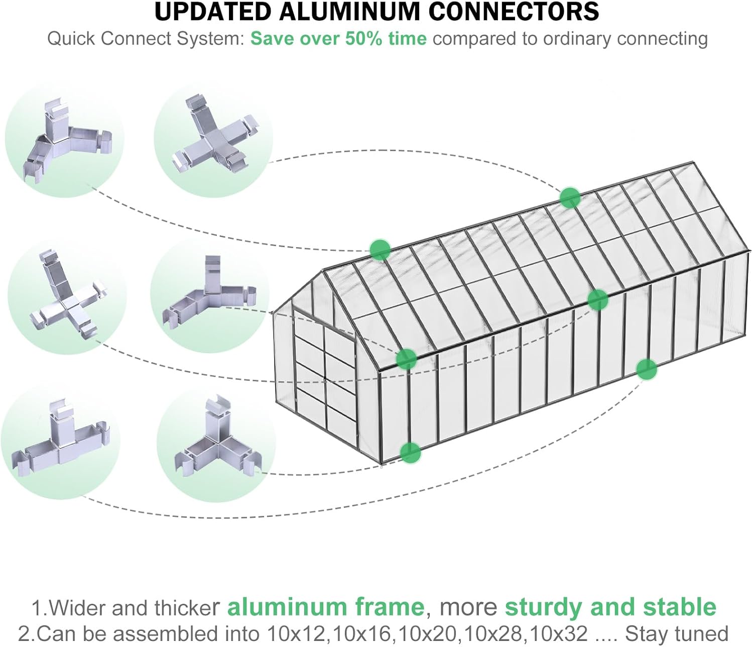 - Sturdy Frame: Our greenhouse kit boasts a robust rust-resistant aluminum frame designed to withstand various weather conditions. Introducing patented technology, Easy assembly, saving you 50% of your time. Gone are the days of tedious setups. With a simple push and locking screw, our Quick Connect ensures a reliable, secure, and swift link-up. It can also support snow loads of up to 20PSF.