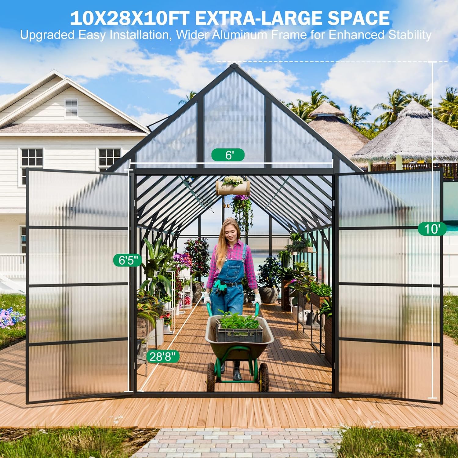 CDCASA 10x28 FT Greenhouse for Outdoors,Large Easy Assembly Thicker Aluminum Polycarbonate Greenhouses w/6 Windows, Double Door, Walk-in Green House for Outside,Patio,Backyard,Garden
