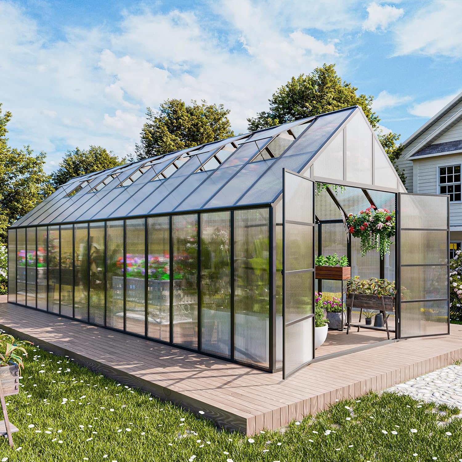 - Durable Panels: These 4mm twin-wall polycarbonate panels are nearly unbreakable. They allow 70% light transmission for optimal plant growth while blocking over 99.9% of harmful UV rays. Perfectly sized for your backyard, terrace, or garden, this greenhouse is great for casual gardeners and flower enthusiasts, providing ample space for plant preparation and growth.