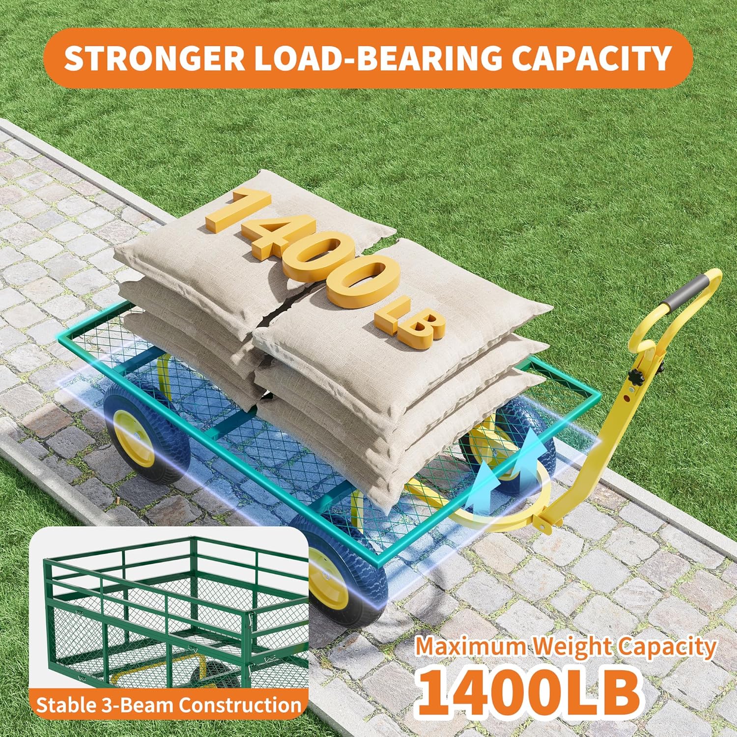 3-in-1 Heavy-Duty Steel Garden Cart, 1400 Lbs Garden Wagon, with 13 Inch All-Terrain Tires and Removable Mesh Side Panels, 180° Rotating Handle, Metal Utility Yard Trailer, Outdoor Gardens Wagon Cart